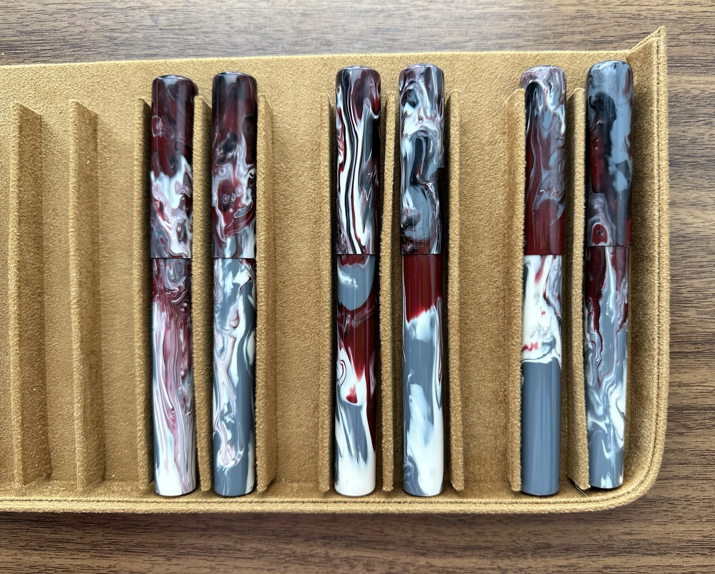 Some stock I have remaining: check out the variation in the material. The pens on the left have tighter swirls of color, the ones in the middle and to the right progressively have larger amounts of single colors (typically either the burgundy/maroon or grey).