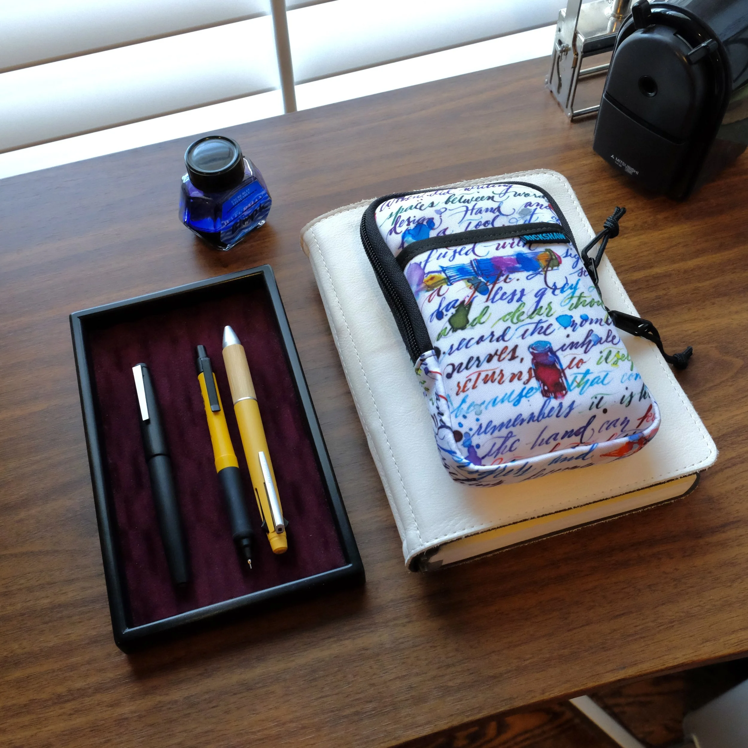 • Pen Case: Rickshaw Bagworks Sinclair Model R. The Sinclair pen case has long been my overall favorite, and it's perfect for my take on the "If I Could Only Keep One" challenge because the case has three slots to hold the Lamy 2000, Kuru Toga, and Jetstream Multipen, with room to carry other items I might need such as an eraser, pencil sharpener, pocket notebook, earbuds, etc. I actually have multiple Sinclairs and use them for all sorts of stuff that I tend to move between bags. (The Model R shown here is the Vanness Pens/Leigh Reyes collaboration.)