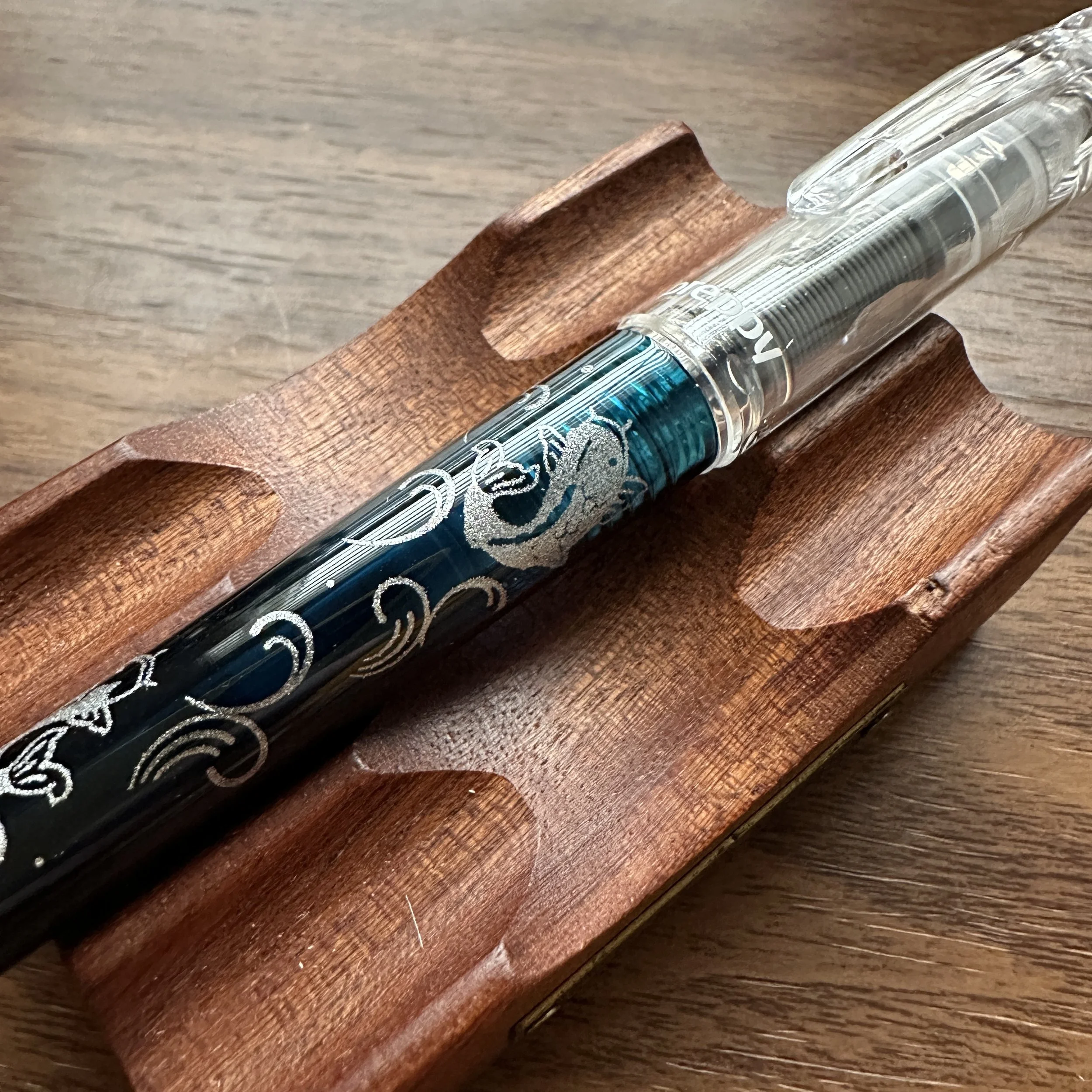 David Oscarson Art Nouveau (via Figboot on Pens). You don’t see many online reviews at Oscarson pens, but they are known for their intricate artwork (and corresponding price point).