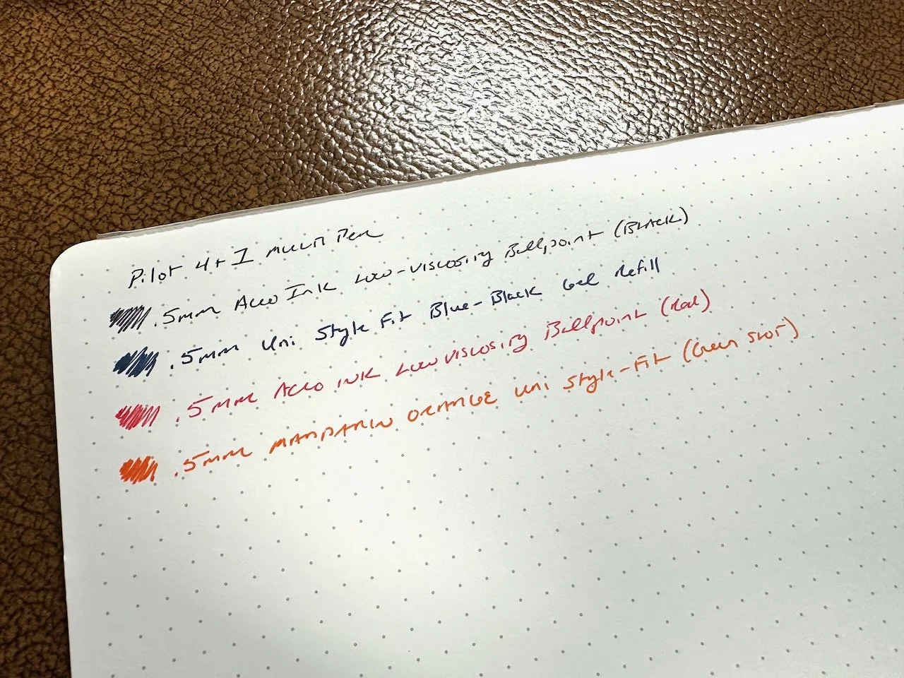 From top: Pilot Acro Ink in black, Uni Style fit in blue black, Pilot Acro Ink in red, and Uni Style fit in Mandarin Orange.