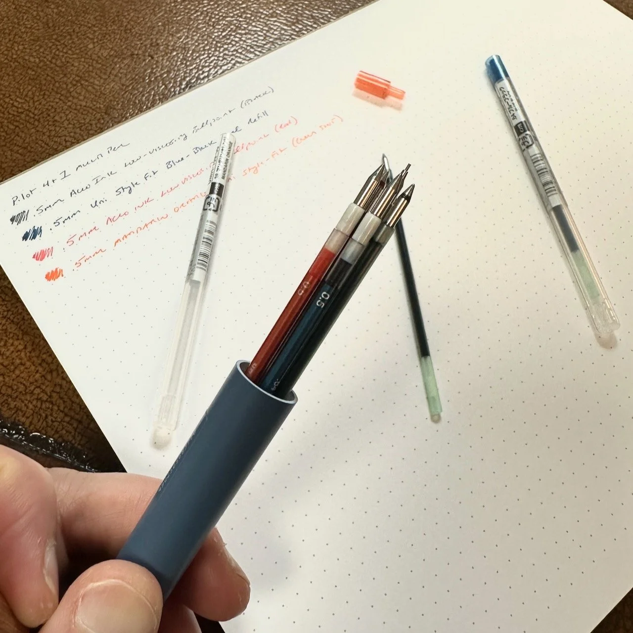 Here, you can see that I have taken one of the blue Pilot 4+1 pens and swapped in two .5mm Style Fit refills in Mandarin Orange and Blue-Black. The Acro Ink and Style Fit refills are exactly the same size and shape, allowing you to choose from among the 16 Style Fit gel colors in addition to the Acro Ink set.