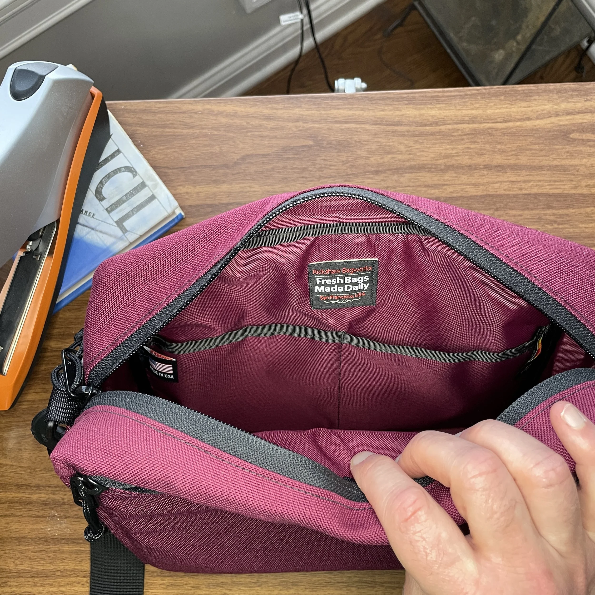 It’s been a while since I did a “Bag Dump” post, probably because I haven’t traveled much in the last six months. For a short 2-day trip like this one, I still carry a fair amount of stationery, especially when the travel relates to a work conference where I’ll be taking a lot of notes. Because this trip doesn’t involve a pen show (sorry, Baltimore!), you won’t see any fountain pens featured here, and this particular Rickshaw Sinclair Model-R permanently holds a fistful of workhorse rollerballs, ballpoints, fineliners, and gel pens, which is what you see above from left to right: