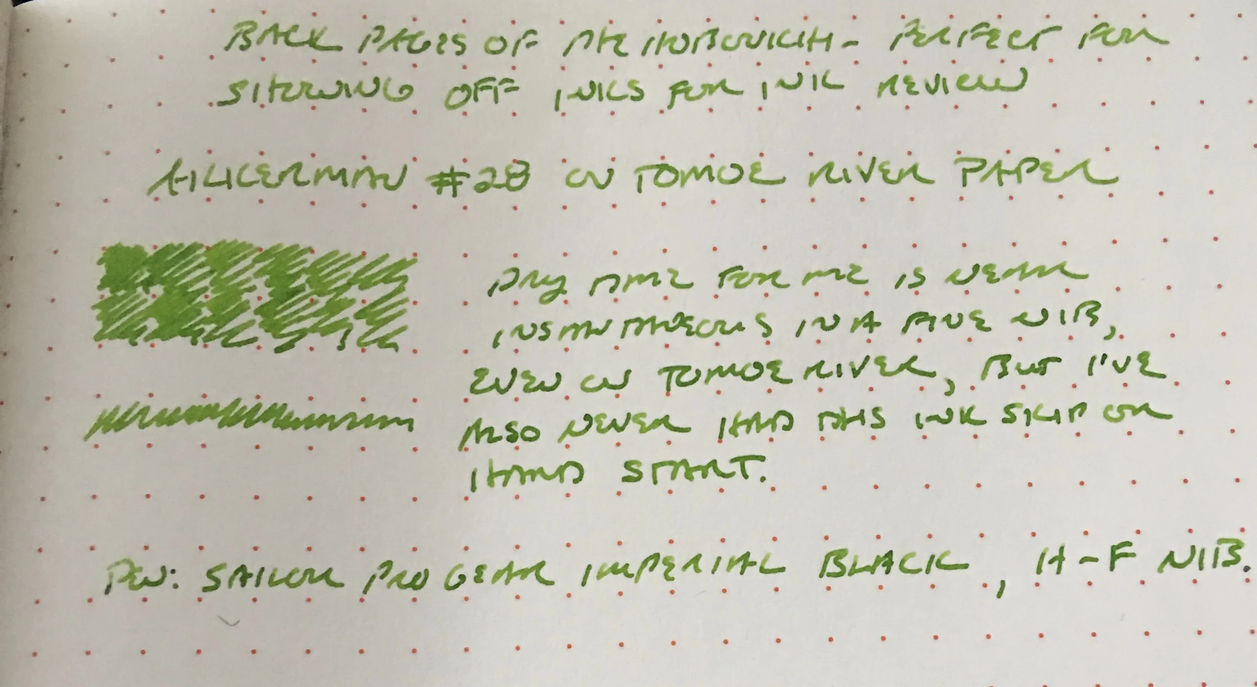 On the wetness/dryness scale, Akkerman #28 is perfectly balanced. I've not had it hard-start in a pen (even in extra-fine or needlepoint nibs), it dries quickly on the page, and it doesn't smear. Currently, this ink sits in my Franklin-Christoph Model 45 orange demonstrator (Masuyama Needlepoint) and my Sailor Pro Gear Imperial Black. I've not experienced any negatives with this ink, but if you use "busier paper" (such as Doane Paper's Grid + Lines design), you may have legibility issues in a very fine nib. On plain, lined, or graph paper, I've had no problems. Akkerman #28 looks especially gorgeous on Tomoe River.