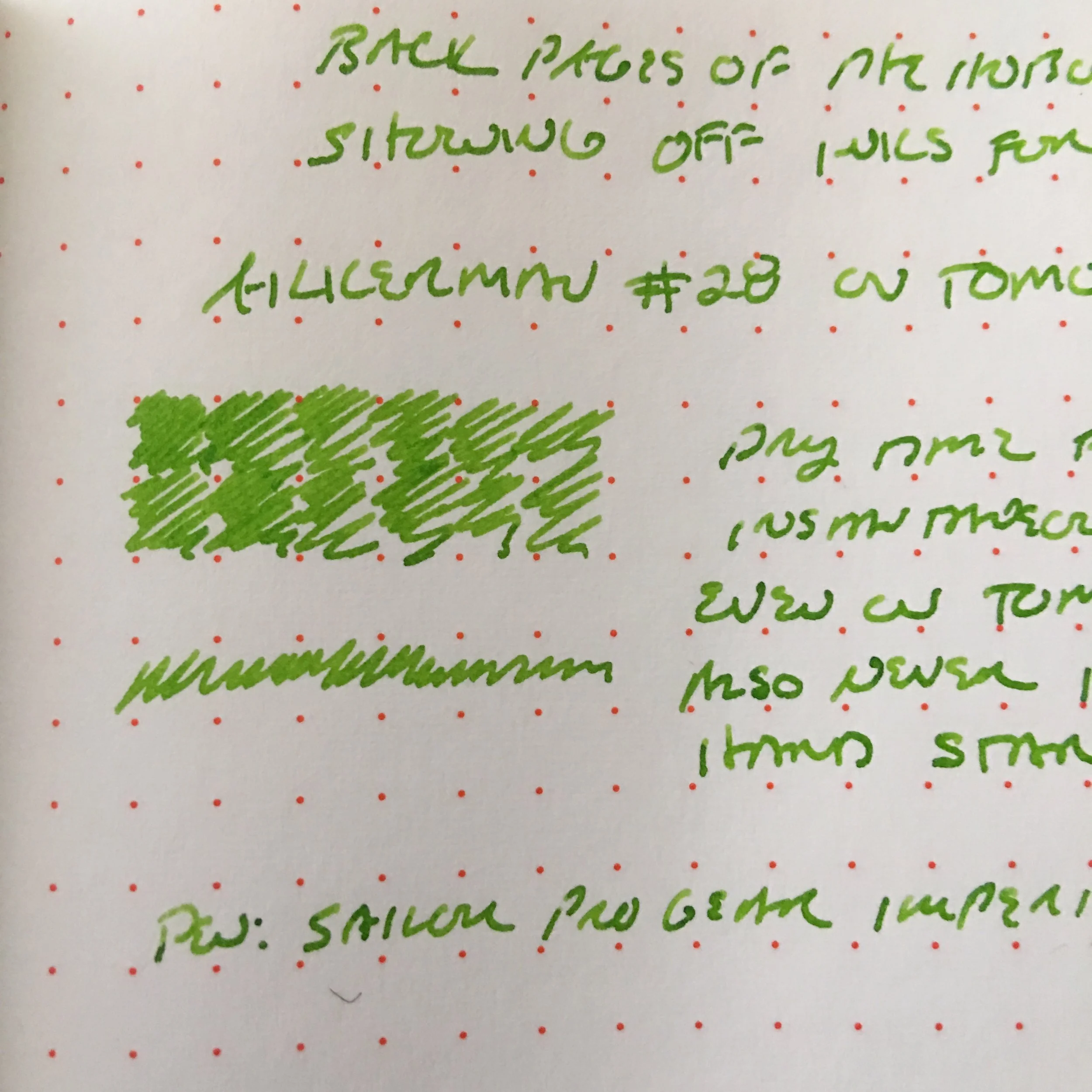 I find most light green inks too pale and/or dry. Also in D.C., I picked up a small 15ml bottle of Iroshizuku Chiku-Rin. While I plan on giving that ink another try in a broader nib, I could barely see the ink coming out of my Sailor Pro Gear with a fine nib. I had no such problems with the Akkerman.