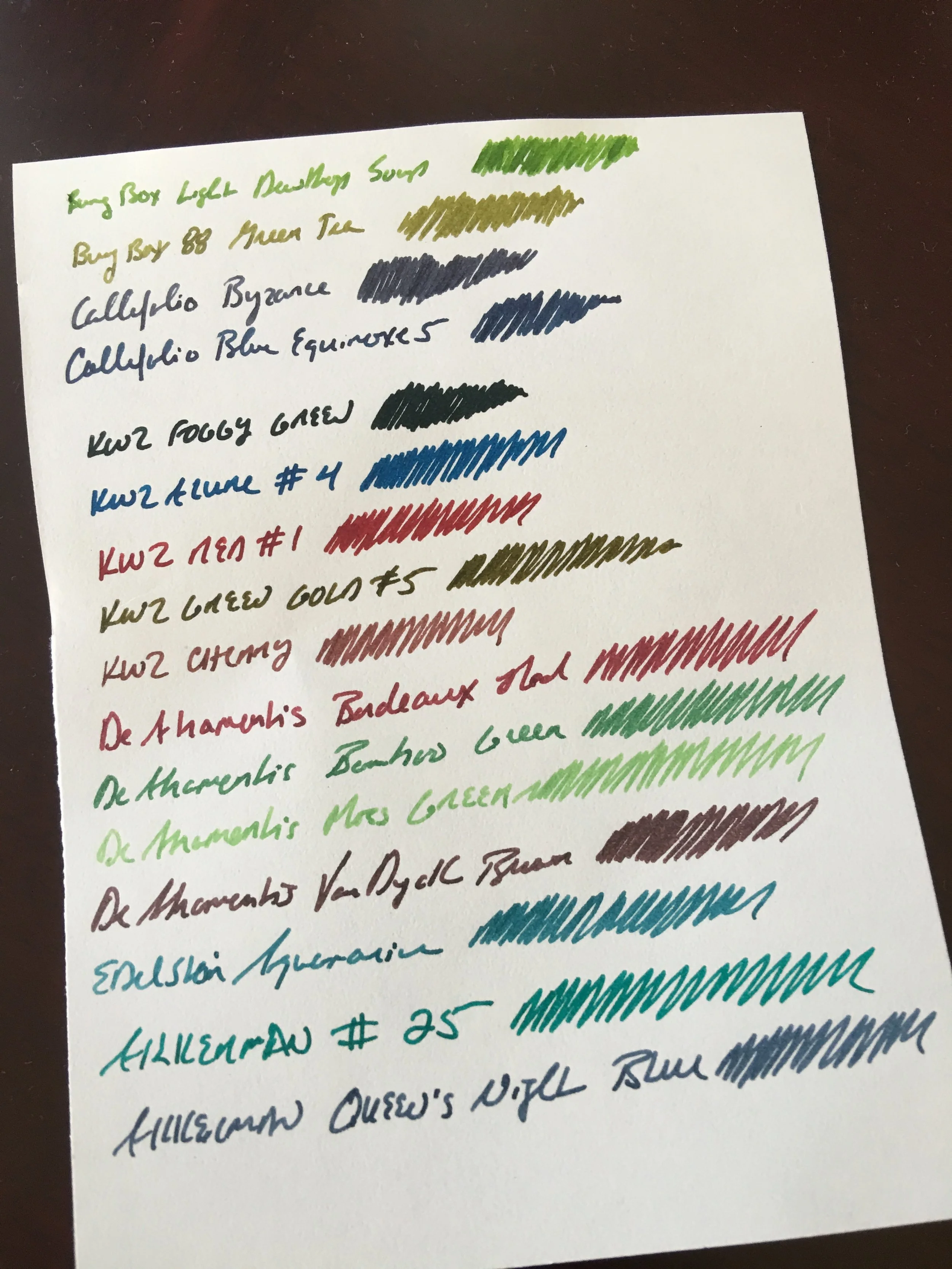 My ink sample sheet from the DC Pen Show. I was trying a lot of lighter green inks, but none of these popped like the Akkerman #28.