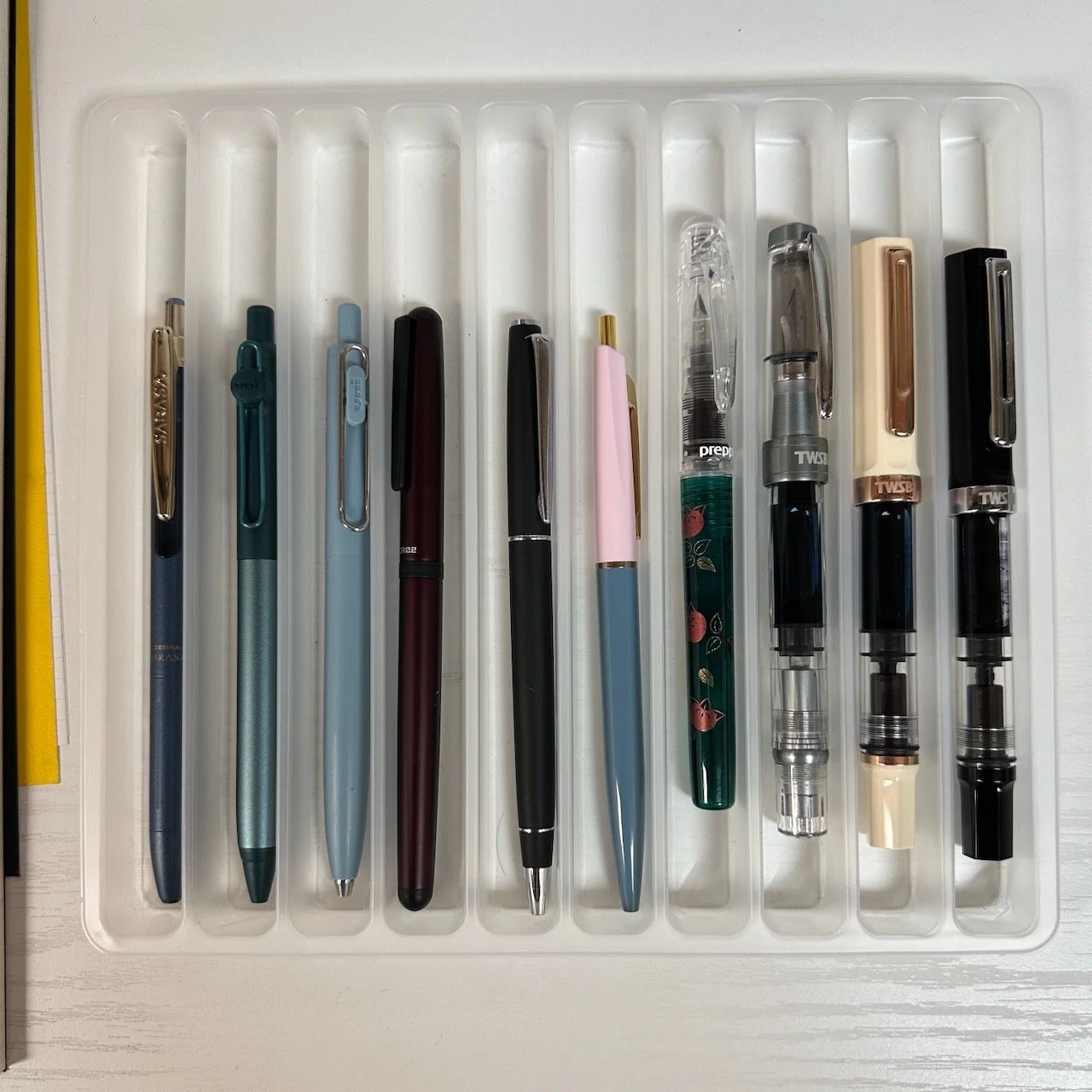 For those who will ask, here’s the current lineup, from left: Zebra Sarasa Grande Vintage, Uni Zento Flow, Uni One, Ohto CR02, Uni Jetstream Prime, Anterique Ballpoint in a custom parts-bin combo by yours truly, a Platinum Preppy Wa, TWSBI Diamond 580 ALR Nickel, TWSBI ECO Creme/Rose Gold, and a standard TWSBI ECO in black.