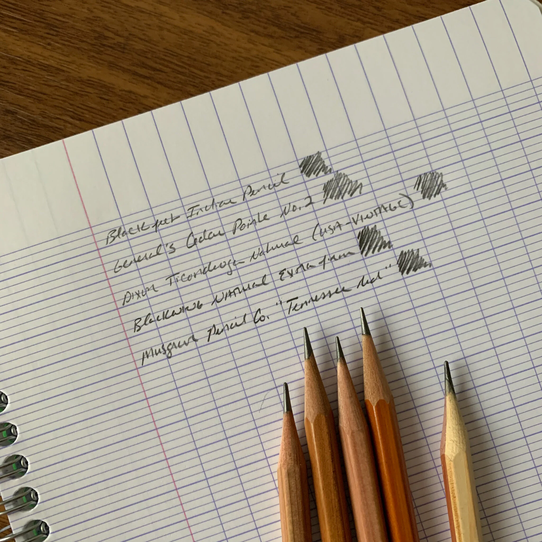The graphite on the Blackfeet Indian Pencil, the General’s Cedar Pointe No. 2, and the Ticonderoga Natural appear close to identical, though the feel of the Blackfeet and the Cedar Pointe is so close that it has me thinking they might even share a core. Both the Blackwing Natural “extra firm” and the Musgrave Tennessee Red feature much darker graphite.