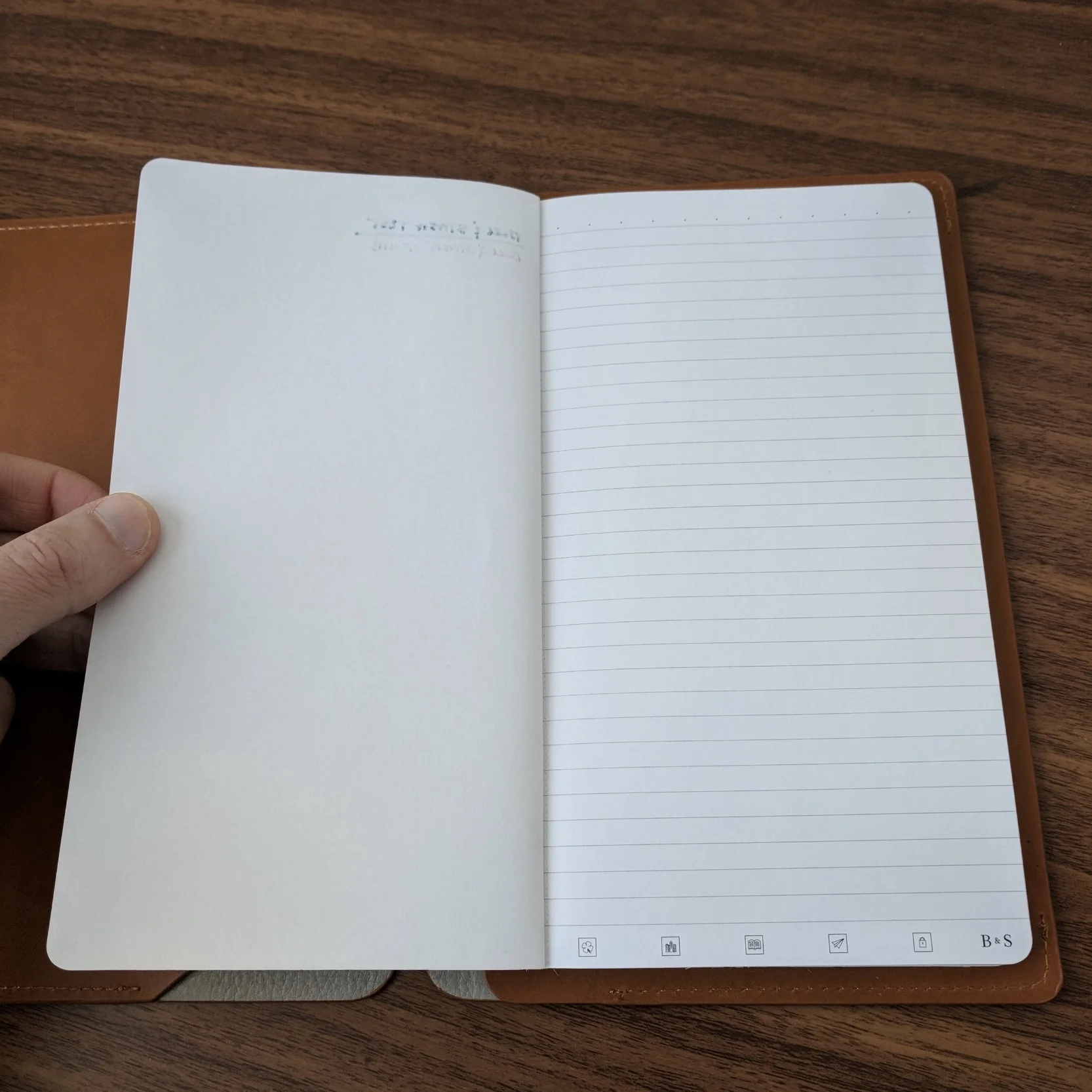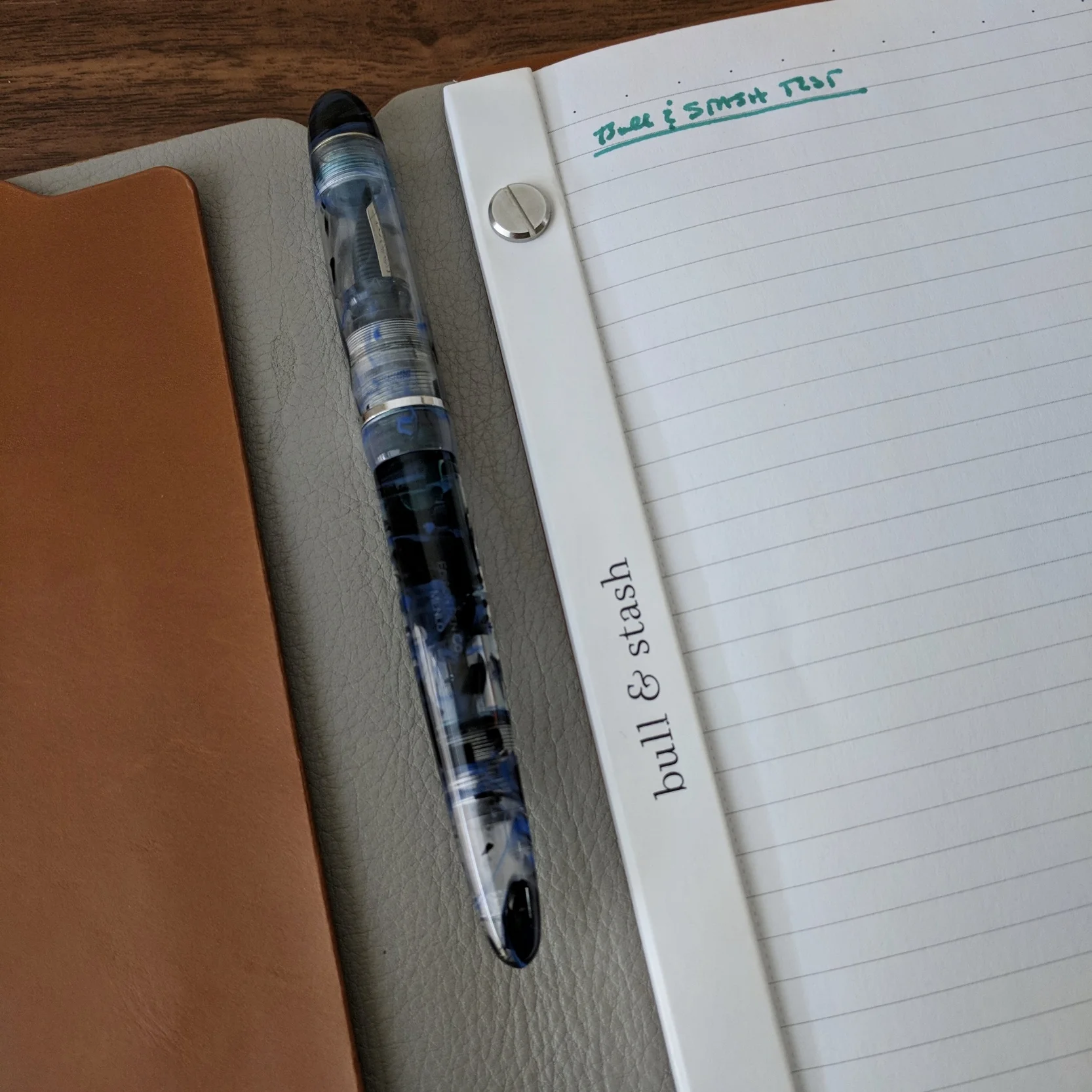 You may have seen me link in recent posts to the new line of updated Bull & Stash notebooks, and I've finally gotten around to taking some pics! Last year, I reviewed the original Bull & Stash "Stash" notebook, which was a softcover notebook with Midori Traveler's Notebook-style proportions (which could actually be modified to accept MTN-style refills, in addition to the proprietary Bull & Stash refills). The new notebook reviewed here, the A5-ish "Leonard" Journal, steps up the quality and functionality, though the continued use of proprietary Bull & Stash refills will likely limit this notebook's popularity.