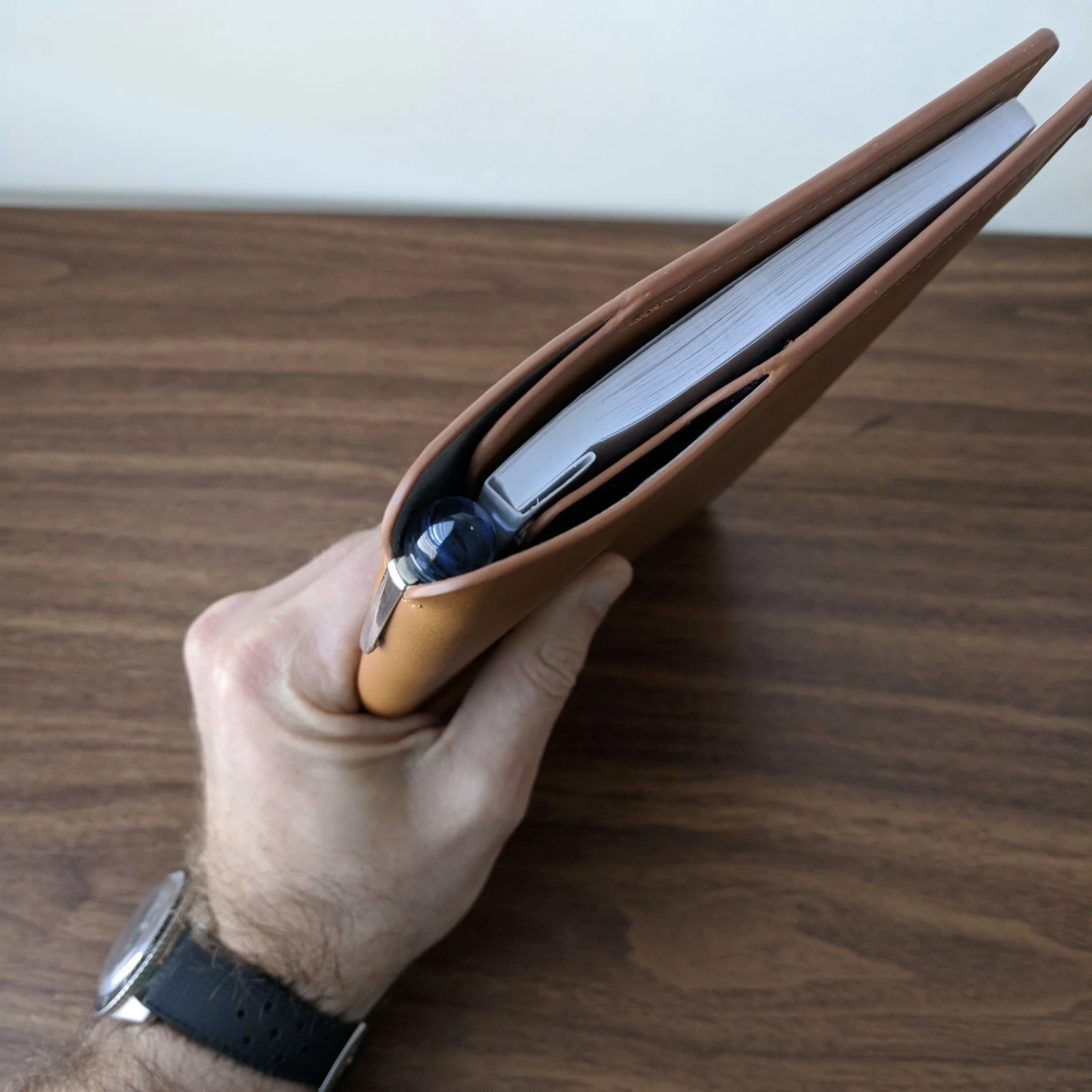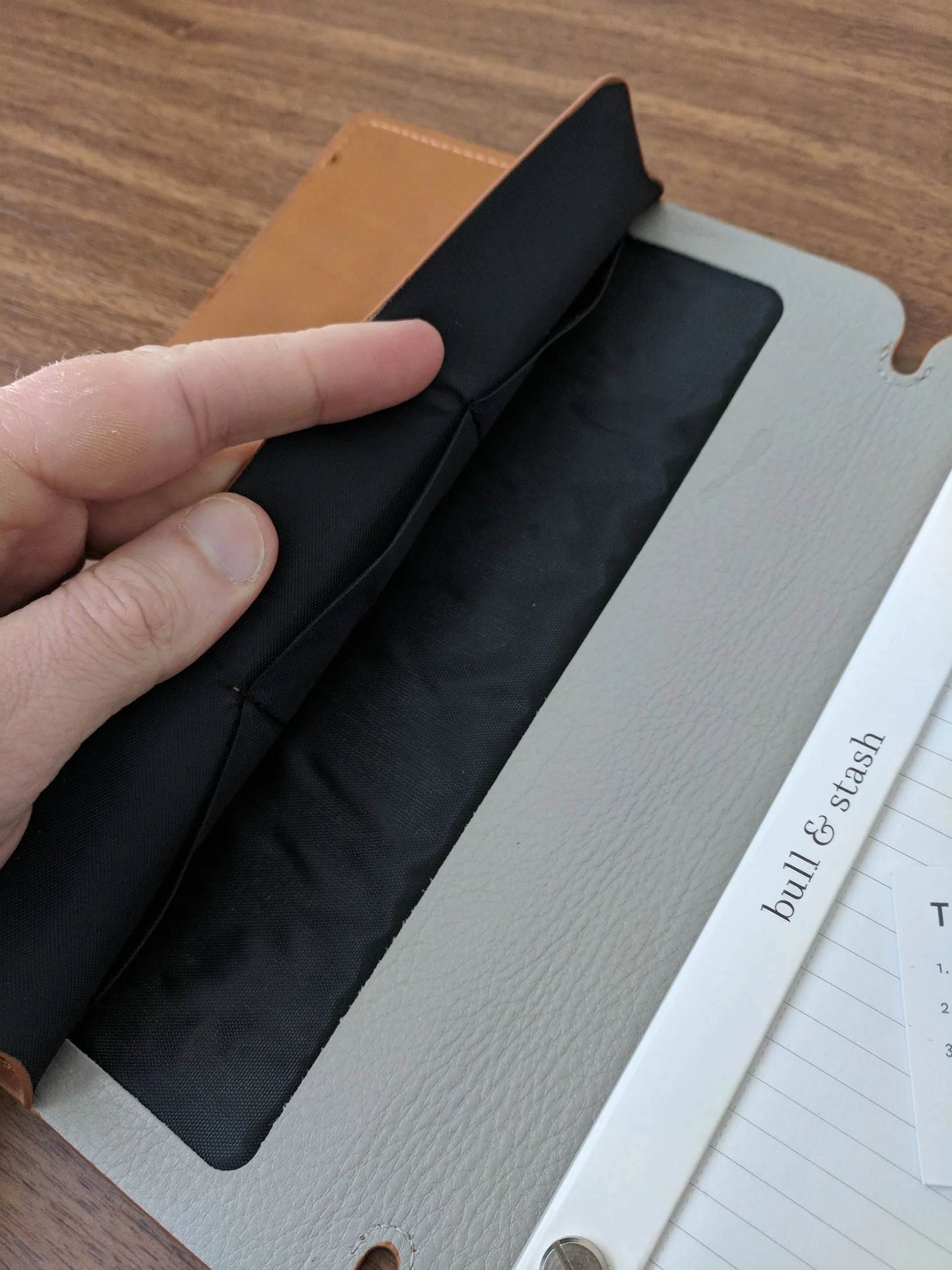 The design of the Bull & Stash Leonard makes it very easy to clip a pen to the inside, even a moderately large pen like this Edison Menlo. The notebook will still close with the pen, and the cover has magnets inside to keep it shut.