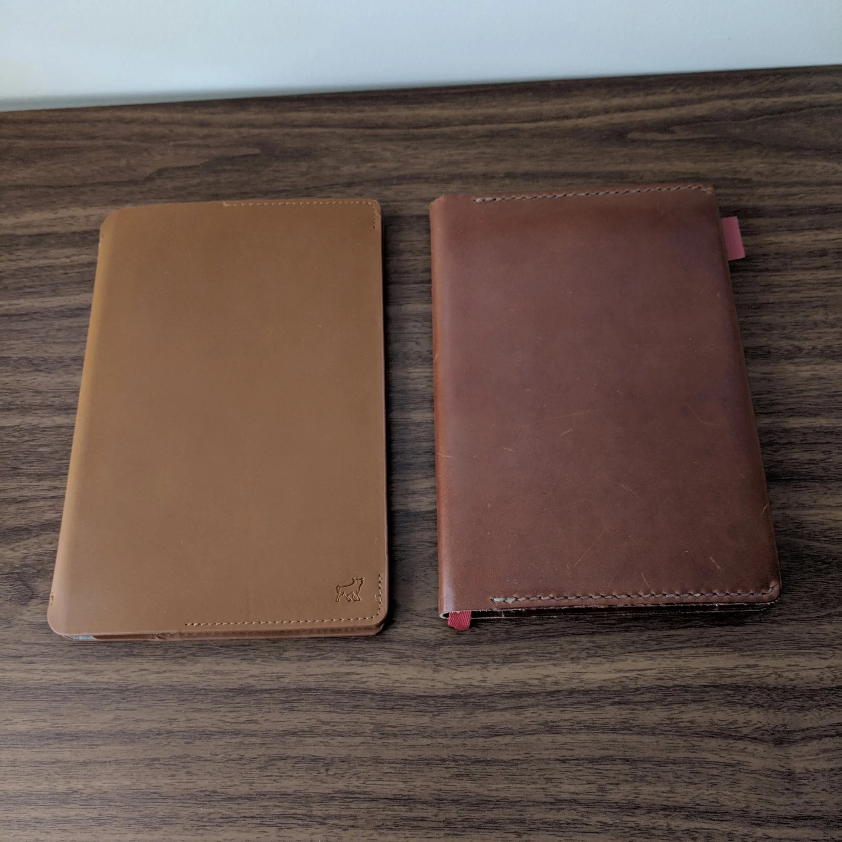 The Bull & Stash Leonard, left, compared against the Baron Fig Confidant, in a One-Star Leather Goods Cover.