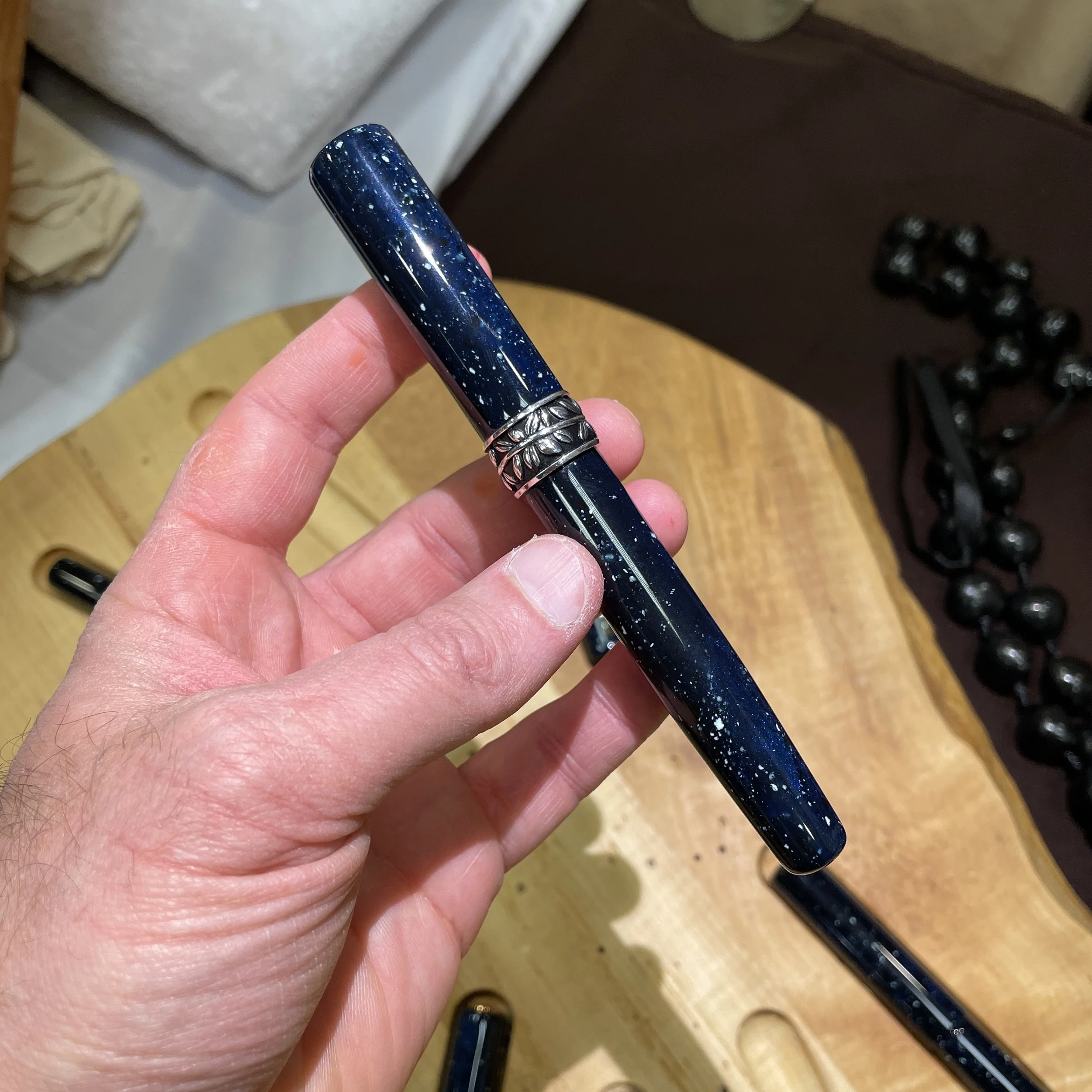 New Release No. 2: Edison Jameson 2024 Chicago Pen Show Limited Edition. My pen is No. 7 of a (very) limited run of 15, made from older Bexley Scheherazade resin, which is a black translucent acrylic resin featuring streaks of silver foil. And, yes, it has a No. 8 nib. (You’re noticing a trend here.)