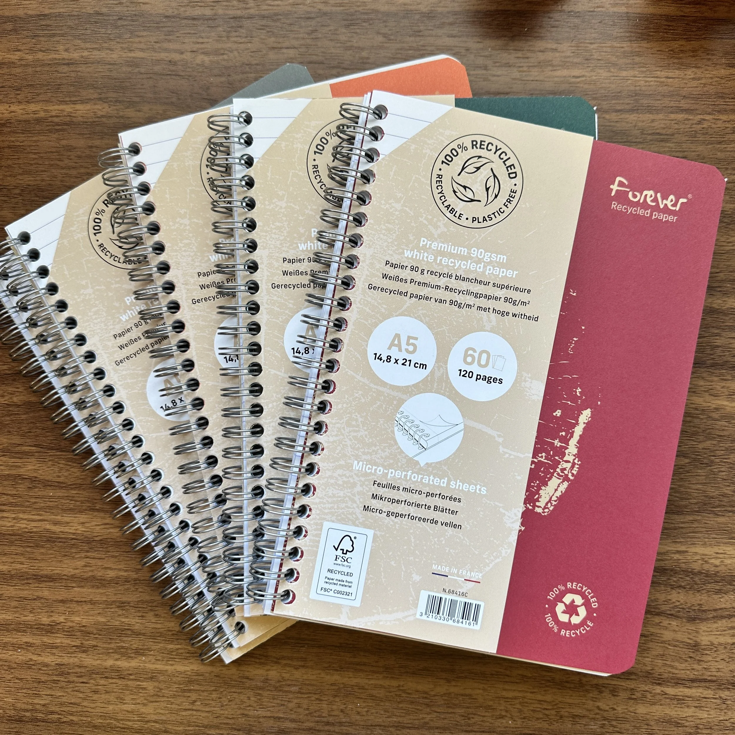 • Clairefontaine “Forever” A5 Spiral Notebook. Featuring 100% recycled paper, these spiral notebooks are lined and entirely micro-perforated, so that you can remove pages for ease of filing/discarding/scanning, whatever you may like. More notebooks need to be perforated for easy page removal!