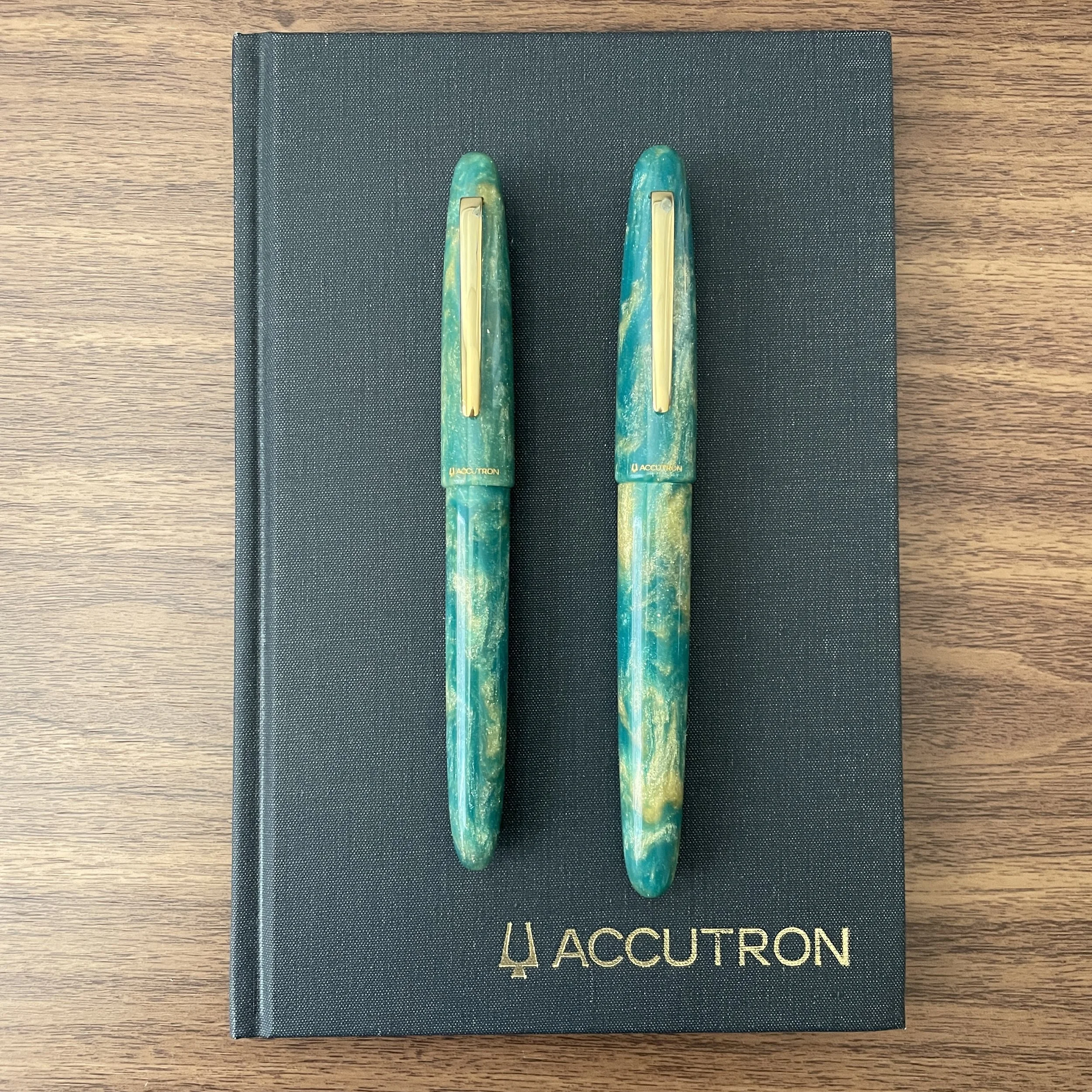 Unlike the Camden, which was available only from select Accutron watch retailers, the new Esterbrook x Accutron Diamondcast Esties pictured here are also available through most major Esterbrook pen retailers. Like other Esties made from Diamondcast material, the price point is higher than standard Estie fountain pens, with the standard model bearing an MSRP of $395 / $316 retail, and the oversized priced at $750 MSRP / $675 retail. (The Oversized version comes only with a 18k JoWo Nib.) If you’re a fan of this green and gold Diamondcast material, or looking for an Accutron-branded Estie to match a recent watch purchase, I’d act quickly because these pens are part of a limited edition series and won’t be around forever. In fact, they’re already sold out at some retailers.