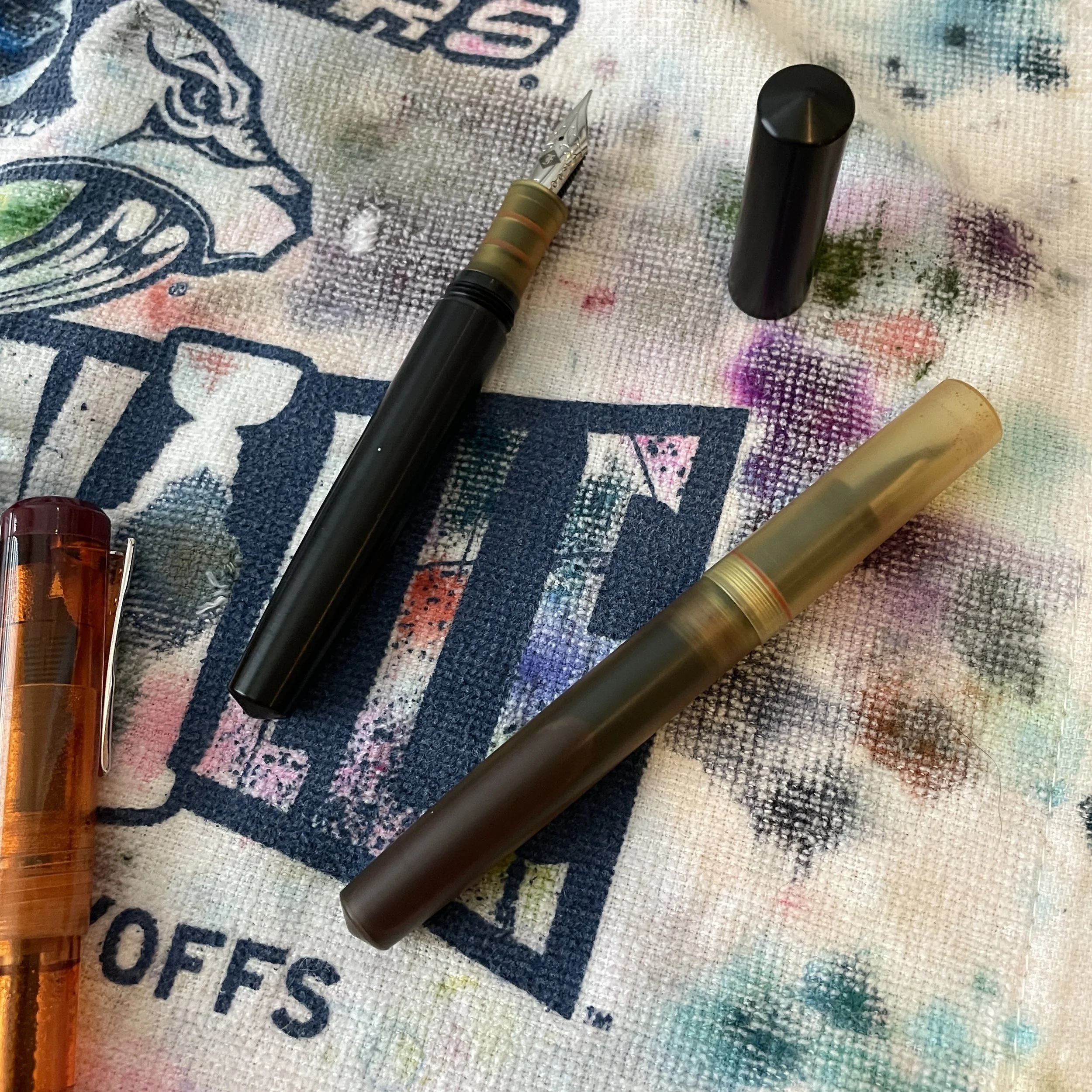 The Schon DSGN Ultem Fountain Pen in Amber (right) is eyedroppered.