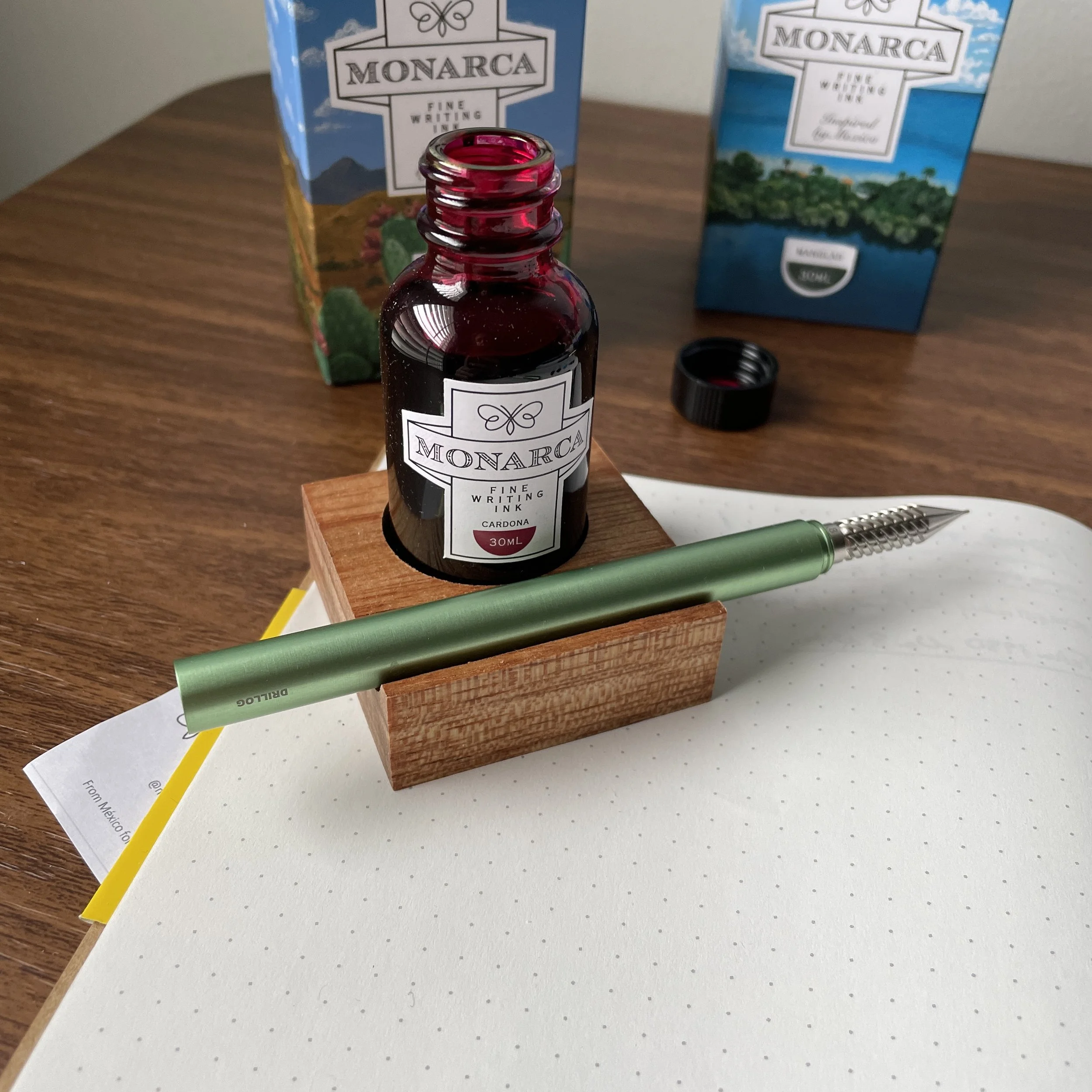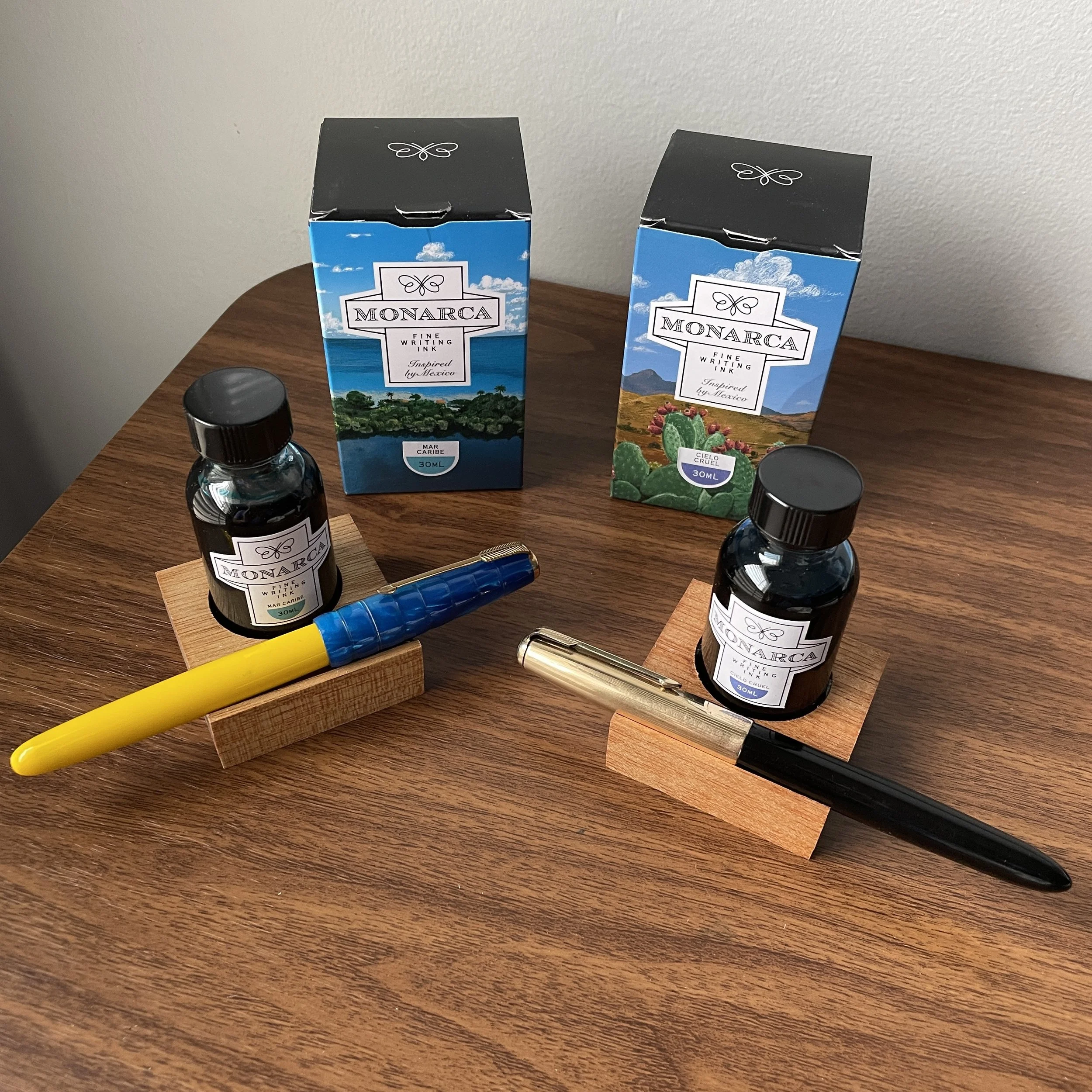I’ve very much enjoyed the design work that Monarca put into packaging their ink. The boxes themselves look like works of art, with images of the Mexican coast, rainforest, and semidesert, depending on which scene inspired a particular color. Each box contains a bottle of 30ml ink along with a banak wood ink stand/pen rest, particularly helpful if you are using these inks with a dip pen. The one downside I’ve noticed with Monarca inks is that the mouth of the bottle is very narrow, making it impossible to fill even medium-gauge fountain pens like the Pilot Custom 823 unless you decant the ink into a different bottle or a sample vial. (You will likely also have to do this once the ink level in the bottle gets low, given it’s tall, narrow shape.)