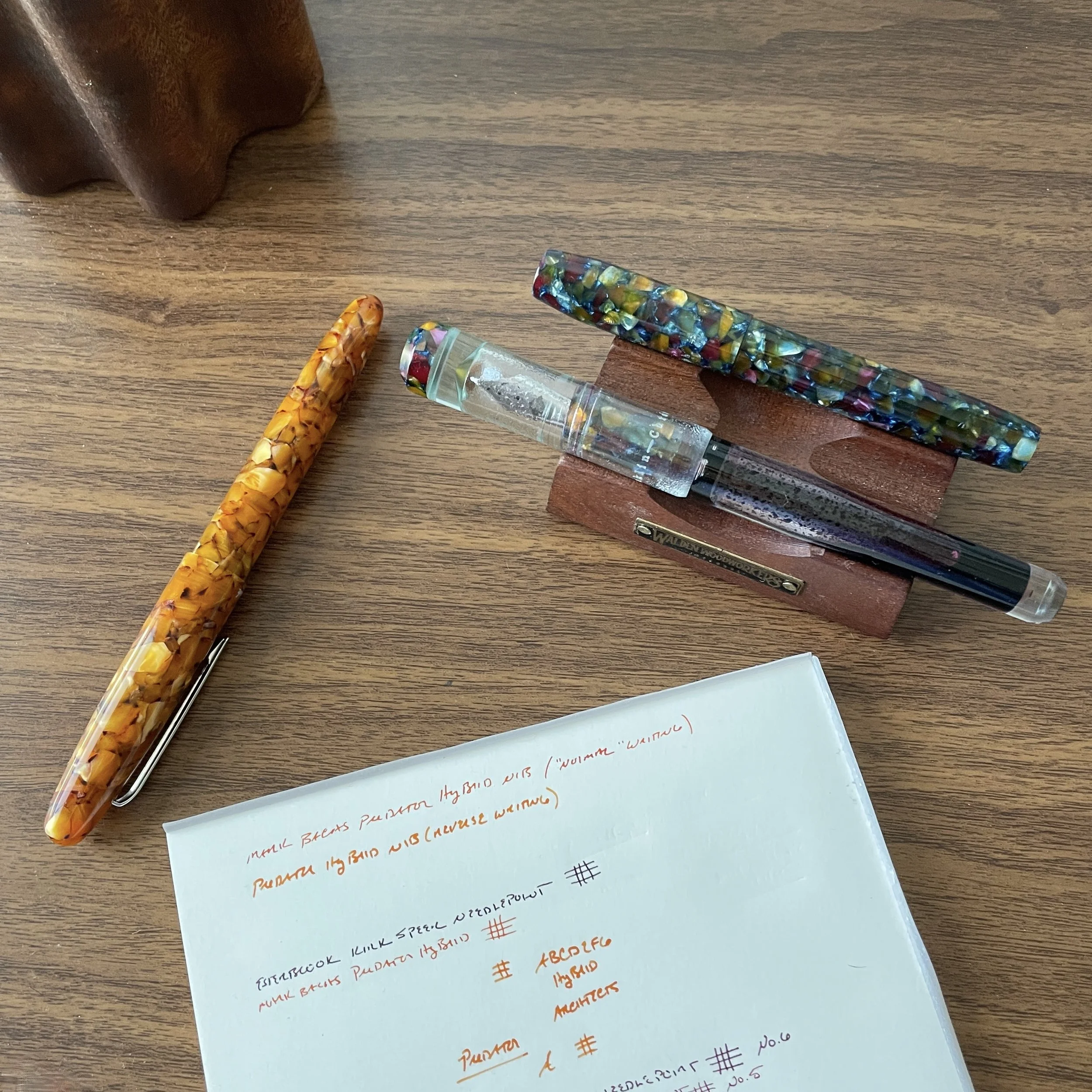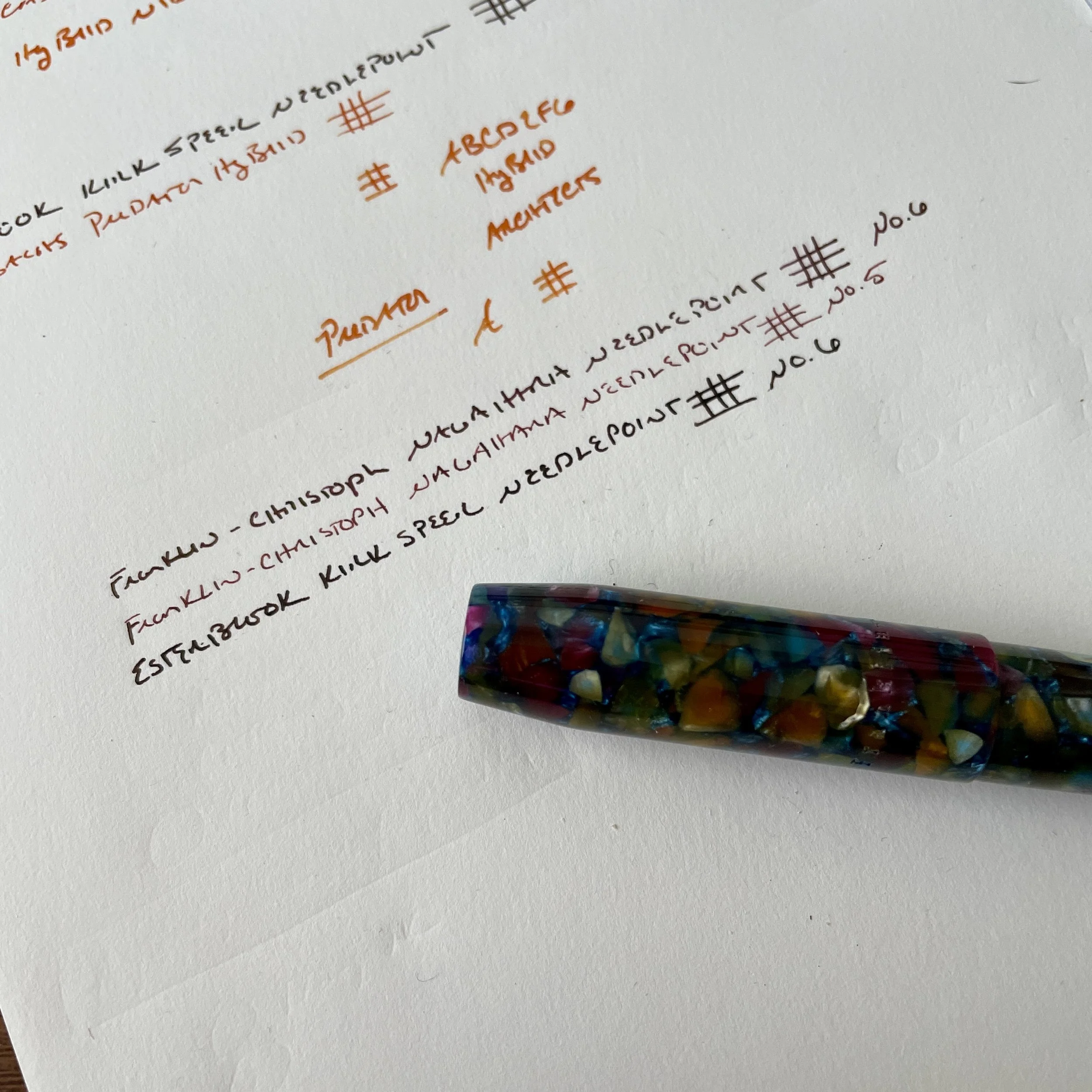 You can purchase these Nagahara-ground Needlepoint nibs as a $25 add-on to the purchase of any Franklin-Christoph pen, such as the Model 02 Intrinsic in Antique Glass and Acrylic shown here, and the Model 45 in full “Cathedral” acrylic. (As you can see, I have a thing for vintage-style flecked acrylic pens.) I purchased these pens at this year’s Baltimore Pen Show, where the team at Franklin-Christoph checked and tuned the nibs to my preference, but both of the Franklin-Christoph pens shown here are currently available for purchase on the site.