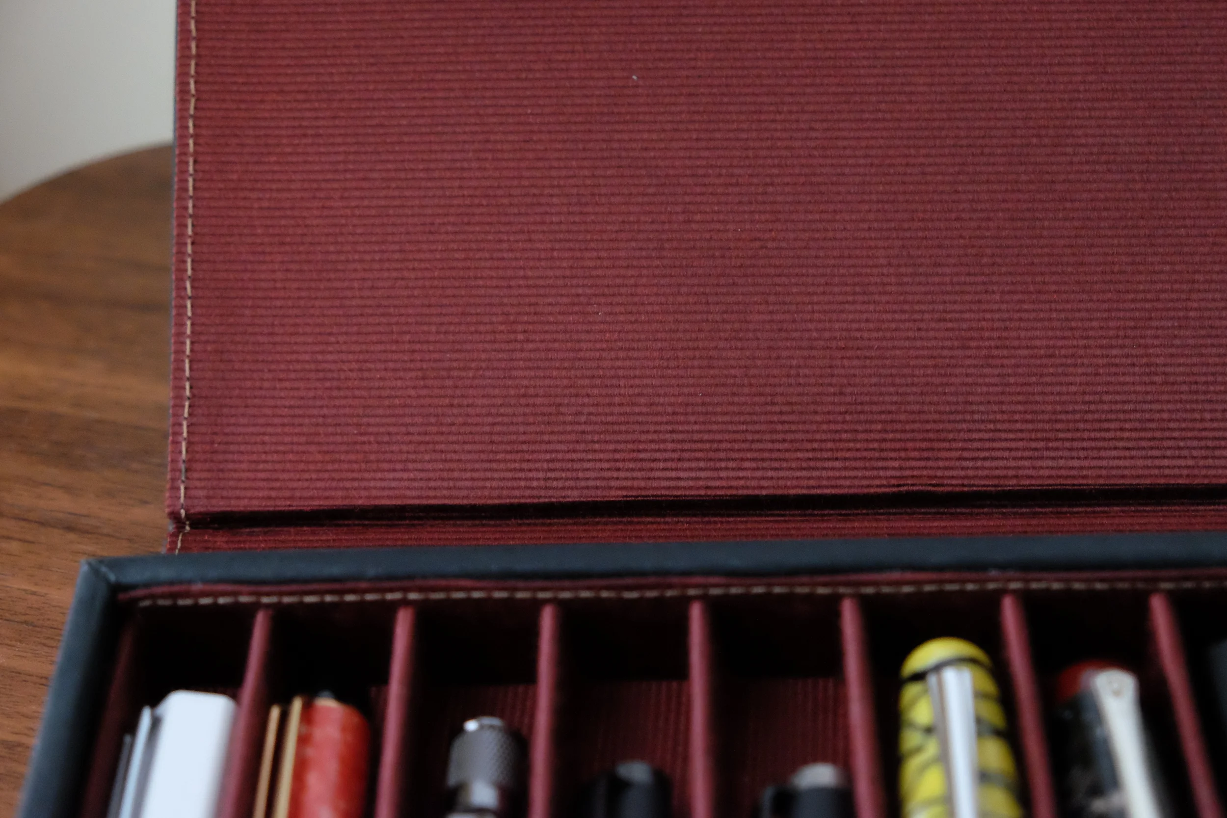 Franklin-Christoph has created a unique product.  Other "display boxes" or pen stands aren't portable, like Levenger's Point of View Pen Case or the various model of boxes and stands offered by Lanier Pens. Personally, I'm partial to leather over wood, so I'll gladly pay the extra premium.  The leather has a good feel to it (as in, not plasticky like some leather used to make inexpensive pen cases), the stitching is flawless, and the burgundy cloth used to line the interior is both attractive and durable.  One note about the interior and the slots themselves: the Covered Pen Tray doesn't use "pre-made" slot inserts that you see in a lot of other pen boxes (and that I used to make my cigar box pen case).  I suspect these are handmade, and the result is a much more high-quality piece than other products I've seen on the market around this price point.