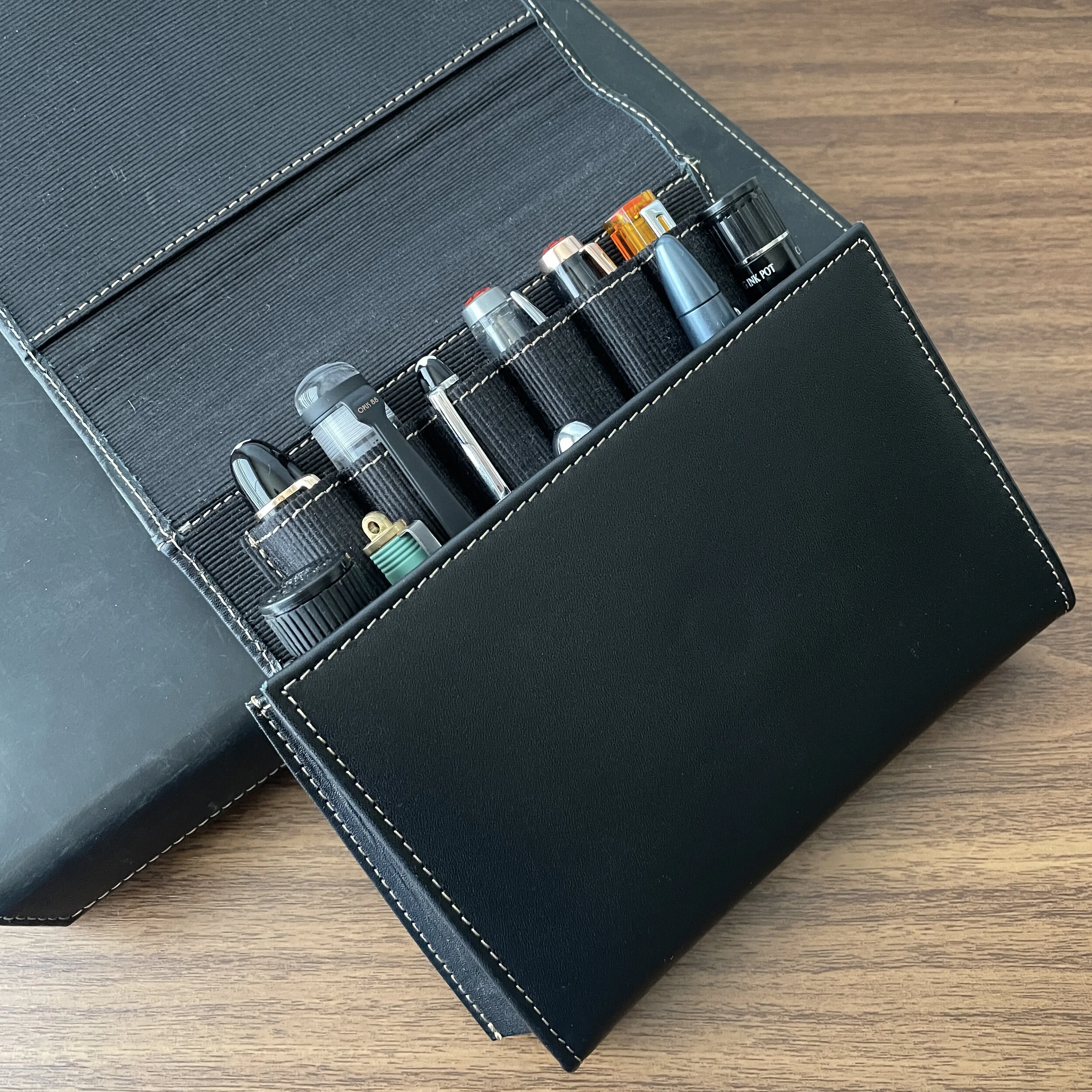 Per the specs, the Penvelope Six holds six pens, but that doesn’t mean you can’t push the penvelope. (See what I did there? Sorry.) Depending on size, you can easily add a few additional pens or mechanical pencils (especially if they’re slender), and I’ve even used the sides to transport traveling inkwells from Visconti and Pineider. Franklin-Christoph leather is high quality, and I’ve had no issues with the finish or build quality on my Penvelope or my Covered Pen Tray that I’ve now had going on five years.