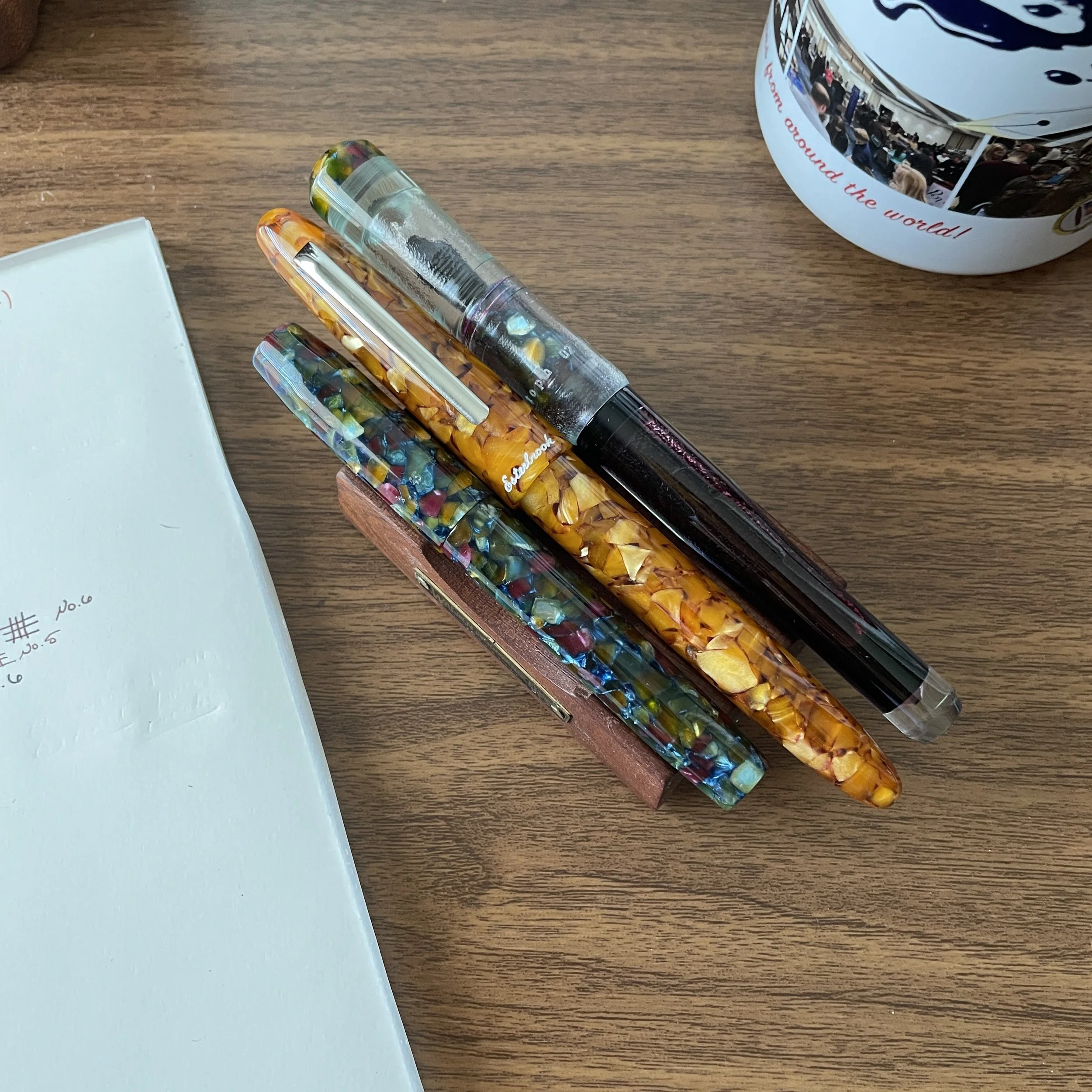 Even if I don’t end up purchasing anything, browsing the prototype trays at the Franklin-Christoph tables is one of my favorite pen show experiences. (It’s rare that you don’t end up walking away from the table with something.) This past weekend, I purchased the Model 02 and Model 45 shown here, both in this dark flecked acrylic with scattered gold, burgundy, blue, and green. (I believe this material is called “Cathedral,” and it’s made appearances at pen shows in the past but I was never able to snag it in a pen model that appealed to me. I’m still looking for a Model 20.)
