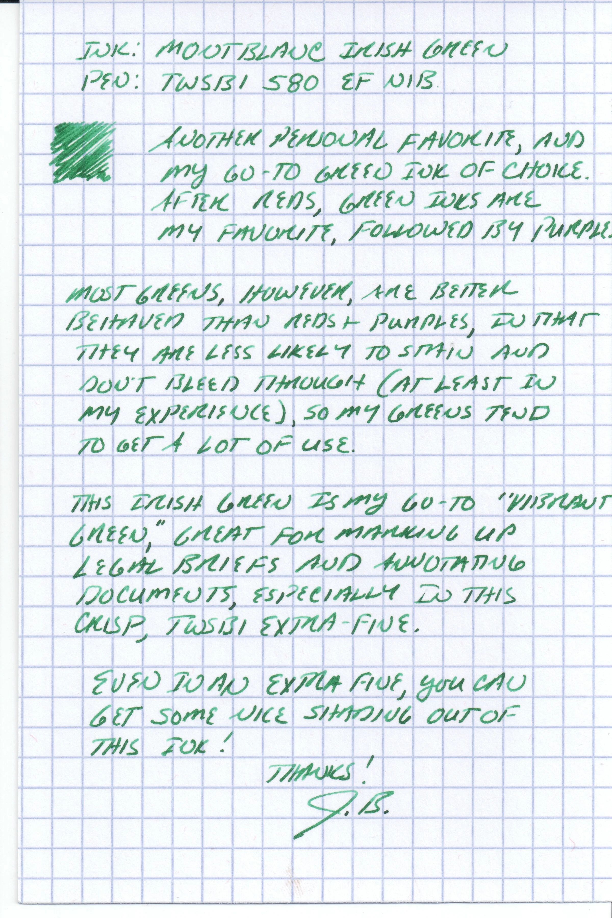 Both green and red inks sometimes bear an unfair connotation as unnecessarily loud or obnoxious colors for writing. That needs to change. You can only take so many blues, blacks, blue-blacks, and even purples in the professional context, and greens present an opportunity to distinguish yourself a bit without going full-on orange shimmer ink. I get more comments - nice ones - on my green inks at work than any other color, and they show especially well in written correspondence.