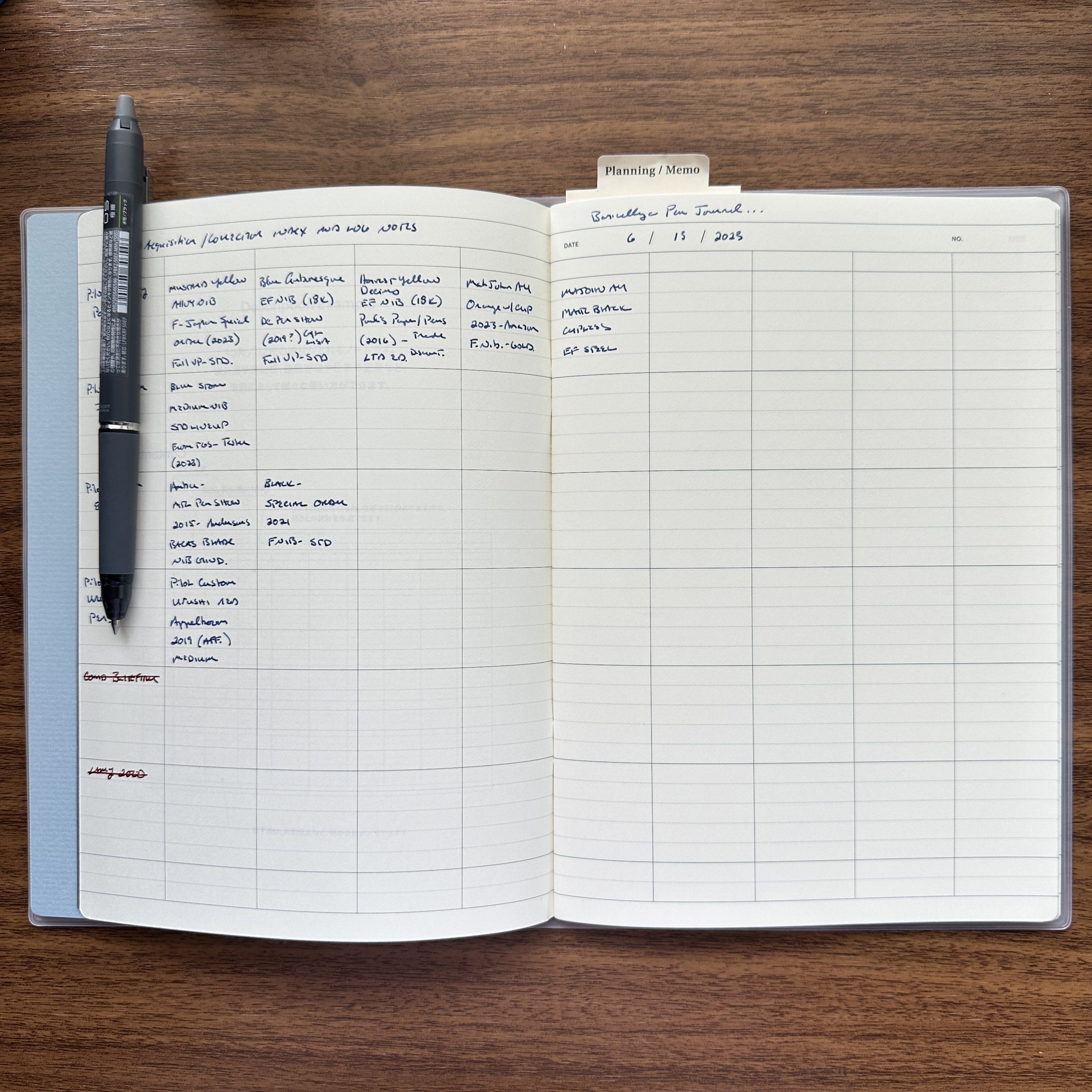 The “Coordinate” Layout from the “Think” Journal with the Pilot Frixion. The ruling is pretty small on these notebooks, so for filling out charts, etc. I’ve used either a super-extra-fine fountain pen with Pilot Blue-Black ink (which holds a fine line quite well) or the Pilot Frixion gel pen.