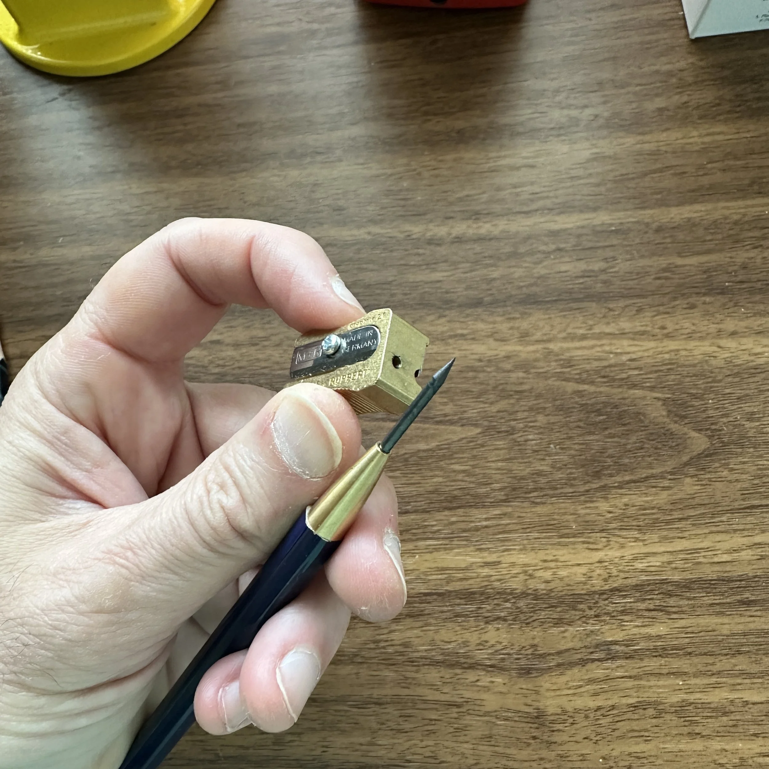 Most leadholders feature a sharpener (or, technically, a “lead pointer”) that’s integrated into the cap. I find these lacking. Over time, the blade loses it’s sharpness - to the extent it was ever sharp to begin with - and shavings tend to cause clogs with no real easy way to clean them out. For me, the solution has been to carry a stand-alone lead pointer, which is basically a small handheld pencil sharpener sized for 2.0mm, 3.2mm, and/or 5-6mm leads. You can see for yourself the difference in points these can produce from the pictures shown here. Because the sharpener doesn’t have to cut through wood, the blades on lead pointers tend to last a long time, and the brass M+R lead pointer shown here uses standard blades that very inexpensive to replace.