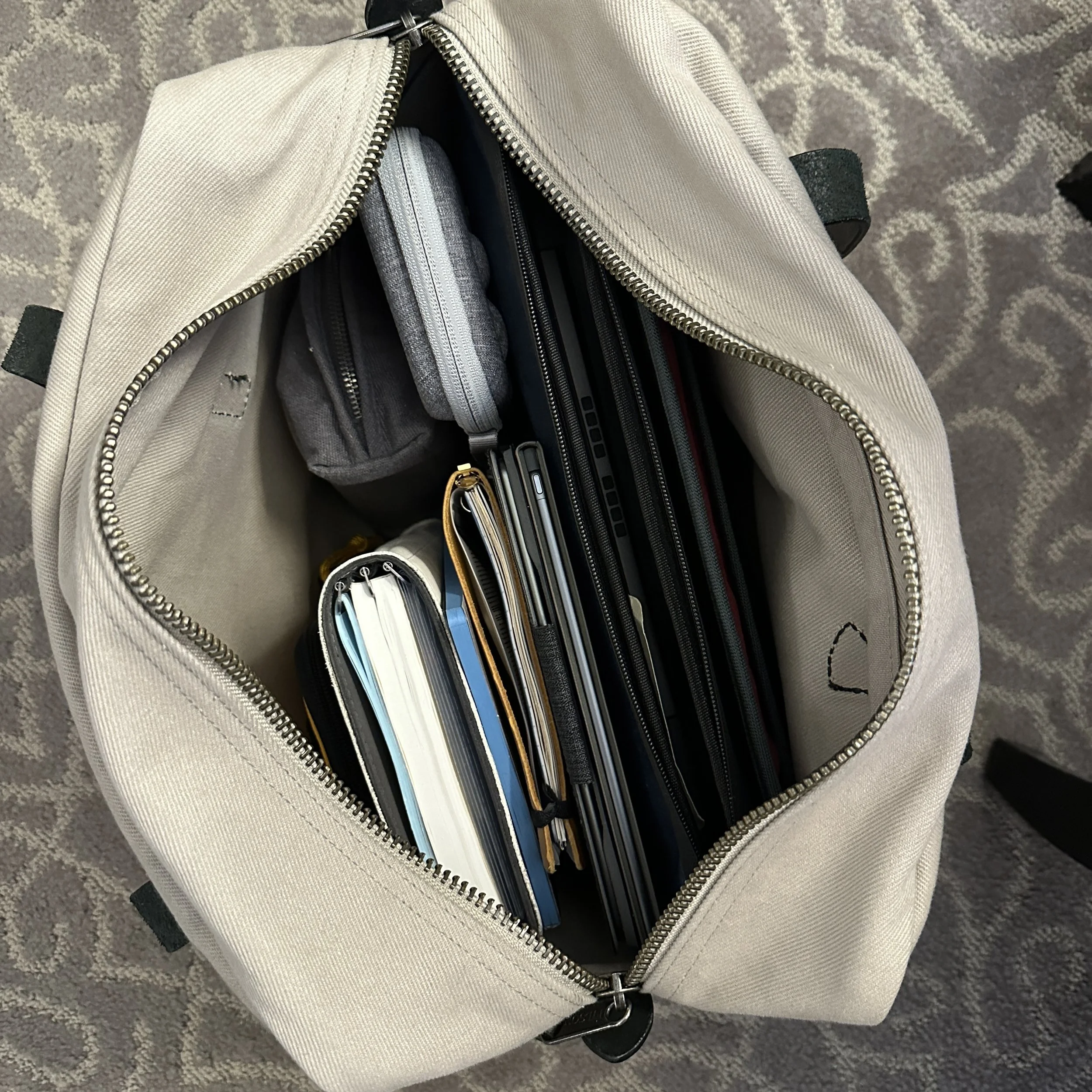 Filson Zippered Tote Bag Open with Stationery Gear Inside