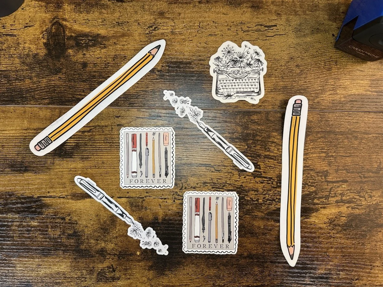 Belle & Union Die-Cut Vinyl Stickers. These analog and stationery-themed vinyl stickers feature motifs that include fountain pens, typewriters, and even a full-size pencil sticker!