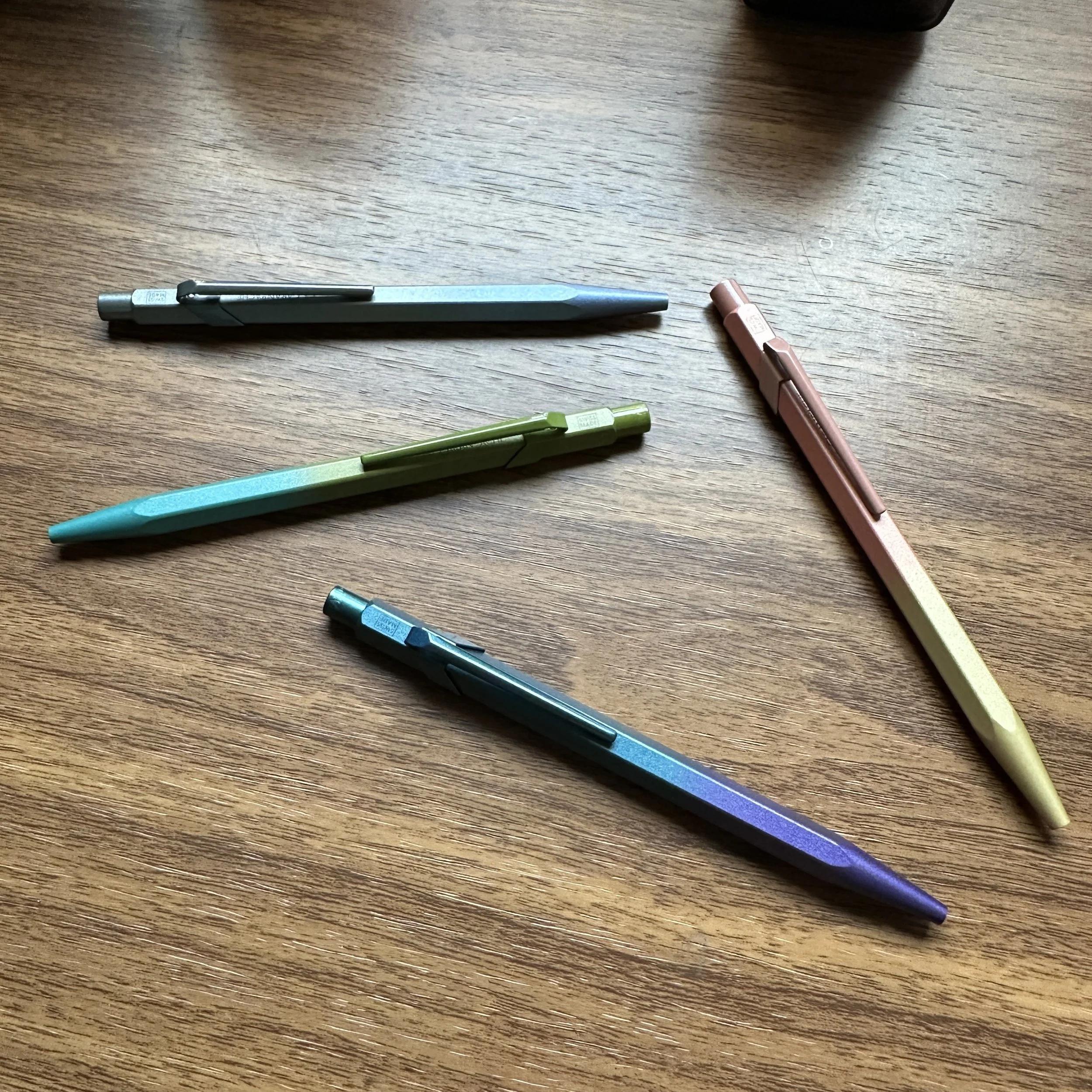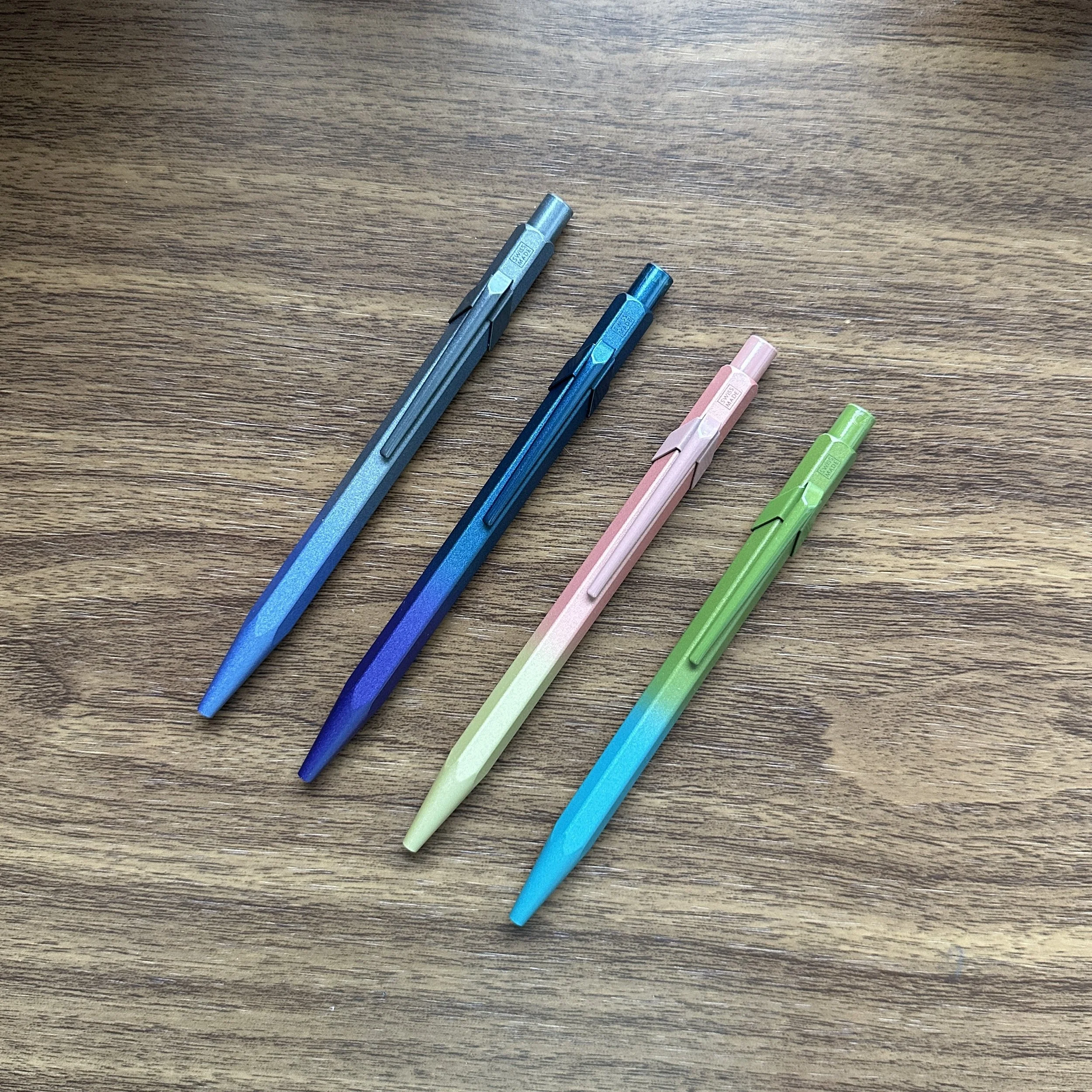 So even though we don’t move into our new space until next week, some recent orders we’ve placed have started to arrive! The most surprising arrival was this year’s Caran d’Ache 849 Claim Your Style Release (the 5th Edition), which features four new Caran d’Ache 849 ballpoints in a matte-gradient finish. I’ve been somewhat underwhelmed by the Claim Your Style Pens in the last couple of years, but these are simply stunning. I think I like the dark blue tones the best. This year, Caran d’Ache also released a special bicolor pencil set to complement the annual Claim Your Style 849, which are sure to be popular as they feature a combination of a dozen different organic, fluorescent, and metallic colors.