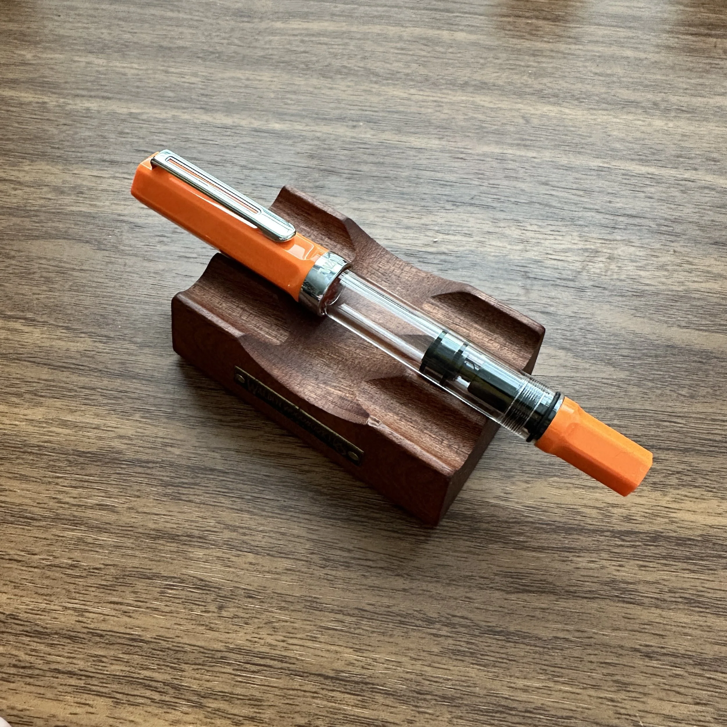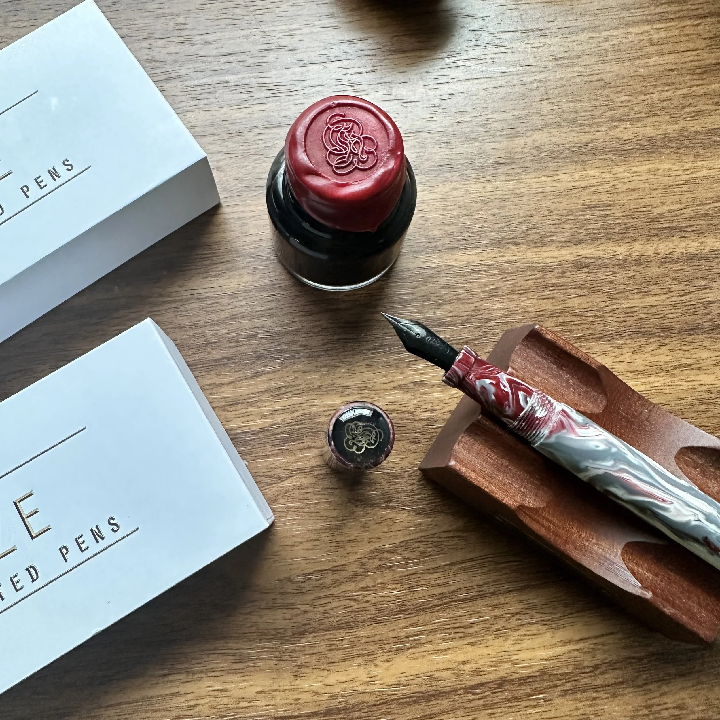 The Majestic is one of my favorite models from Hot Springs, Arkansas-based Shawn Newton, with a comfortable, streamlined design. Our pen features a polished black cap and barrel with a red section, which leaves just a sliver of red visible when the pen is capped. For this release, we’ve outfitted the pen with a custom crimson-plated nib by Hinze Pens, which you may recognize from last year’s Hinze collaboration, only this time we’ve engraved it with the T.G.S. Logo! I’m truly pleased with how this pen turned out, and each one ships with a matching black and red pen sleeve from Elizabeth Newton Designs, as well background information on the pen’s design and a handwritten note from Shawn. These were made available to Patreon members yesterday and are available to the general readership today, priced at $210. Insured shipping is included. A handful of these pens remain available to ship immediately, and if there is additional interest after they sell out I can explore doing a second run.