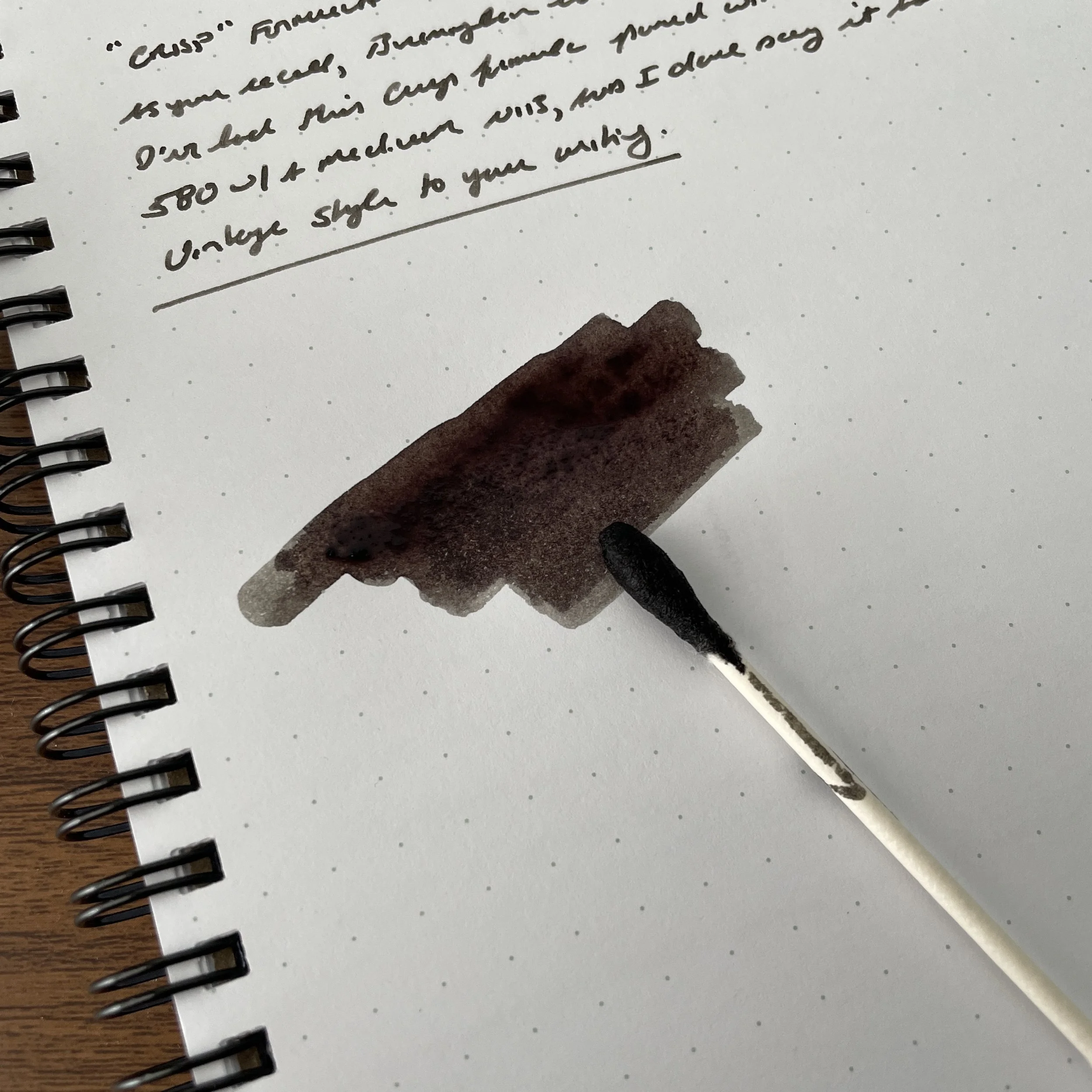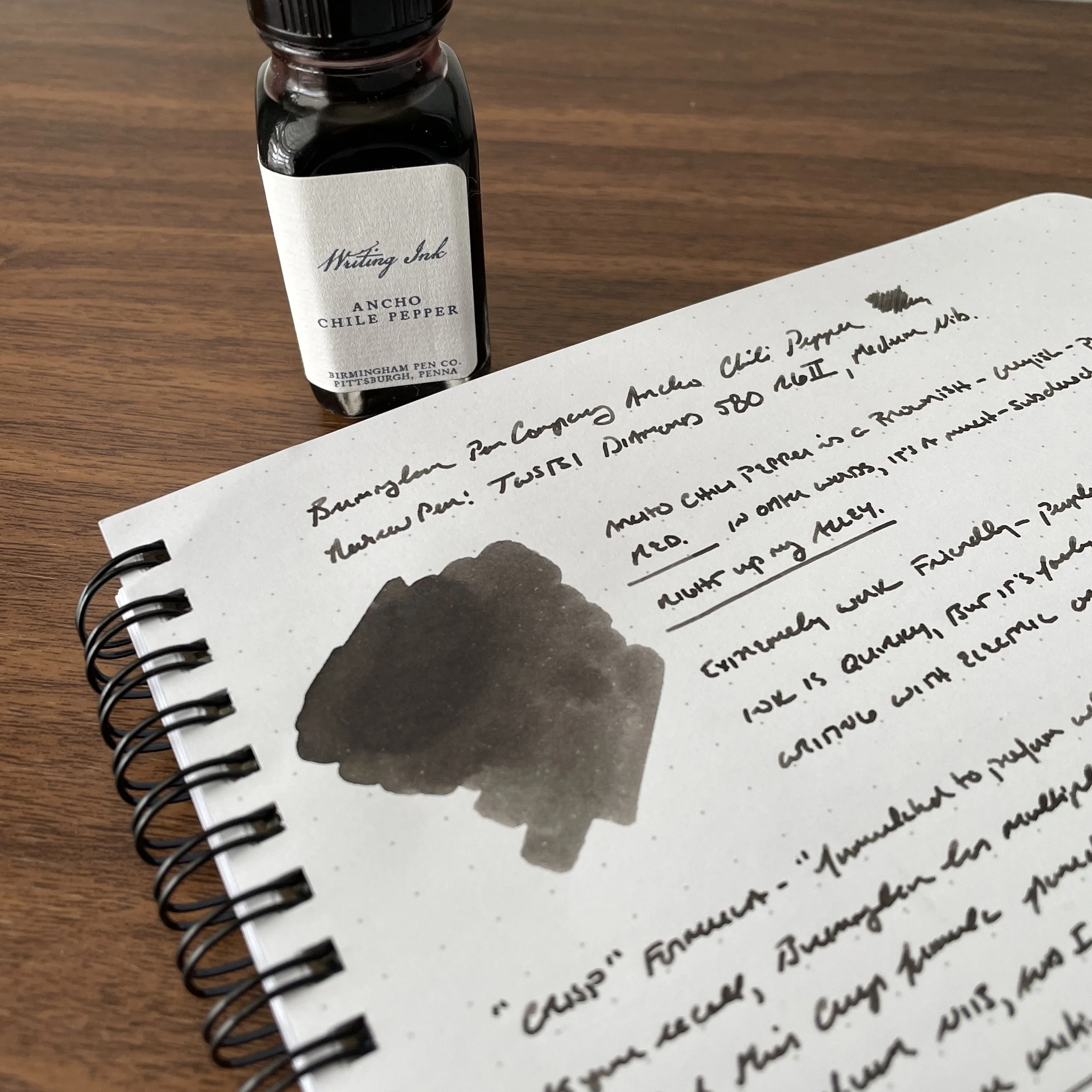 A second Birmingham ink I’ve enjoyed is Ancho Chili Pepper, one of those colors that defies description, in that it’s a greenish-brownish-grey, which on some papers shows purplish or red undertones, especially when still wet. Ancho Chili Pepper features Birmingham’s “Crisp” formulation, meaning that the ink has been crafted to perform well on “a variety of premium, mid-range, and discount papers.” For me, this screams “workhorse ink,” and I can confirm that this ink largely lives up to its promises.