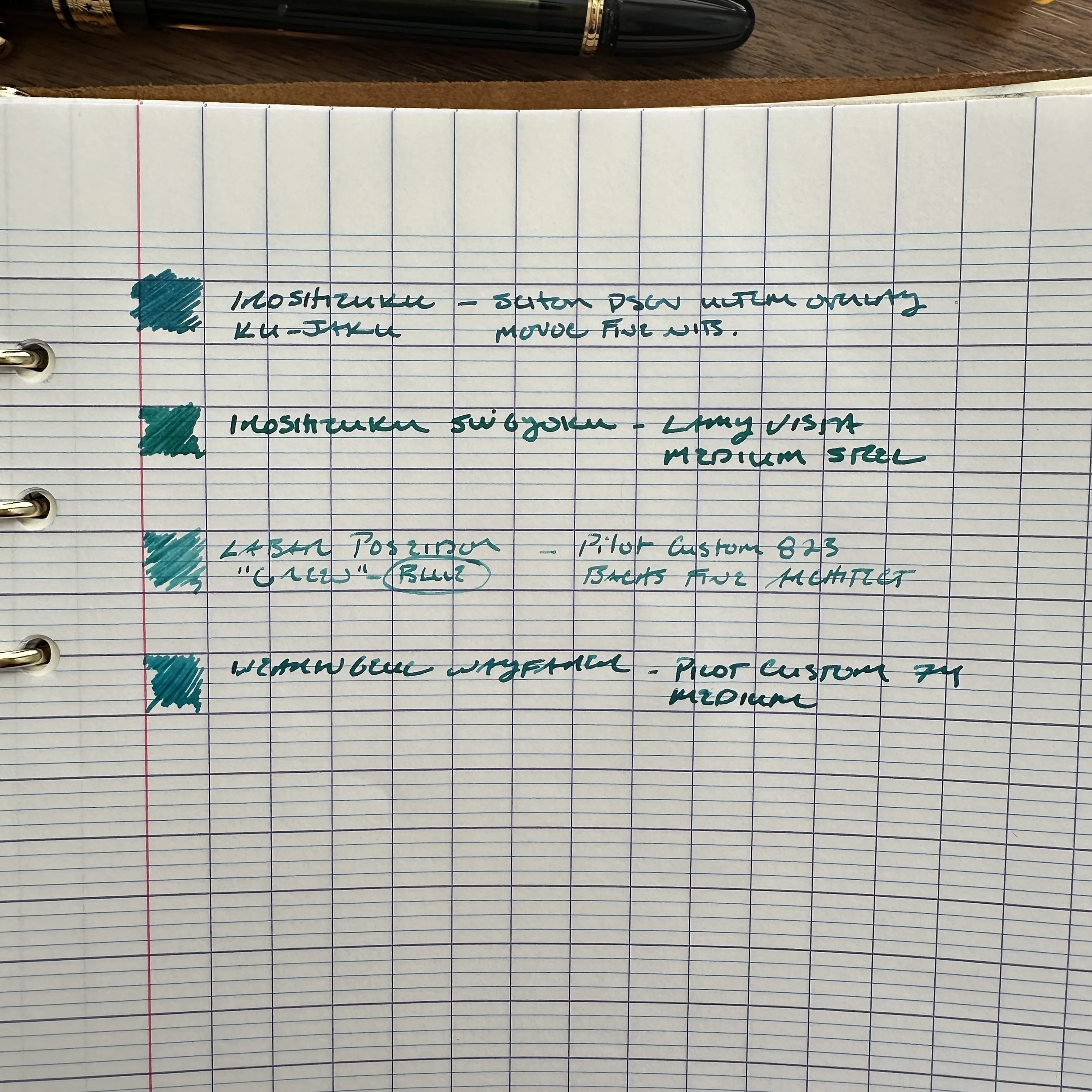 Lately, I’ve focused on four inks for my core “office” rotation: Pilot Iroshizuku Sui-Gyoku, a new release which might be my current favorite from the line; Pilot Iroshizuku Ku-Jaku, an old favorite which shares many of the same tones as Sui-Gyoku, only slightly darker; Laban Poseidon Green, which I consider a blue ink despite how it’s marketed; and Wearingeul Wayfarer, a shimmer ink with subtle pink sparkles that can also be used as a standard ink if you fill the pen without first shaking the bottle.