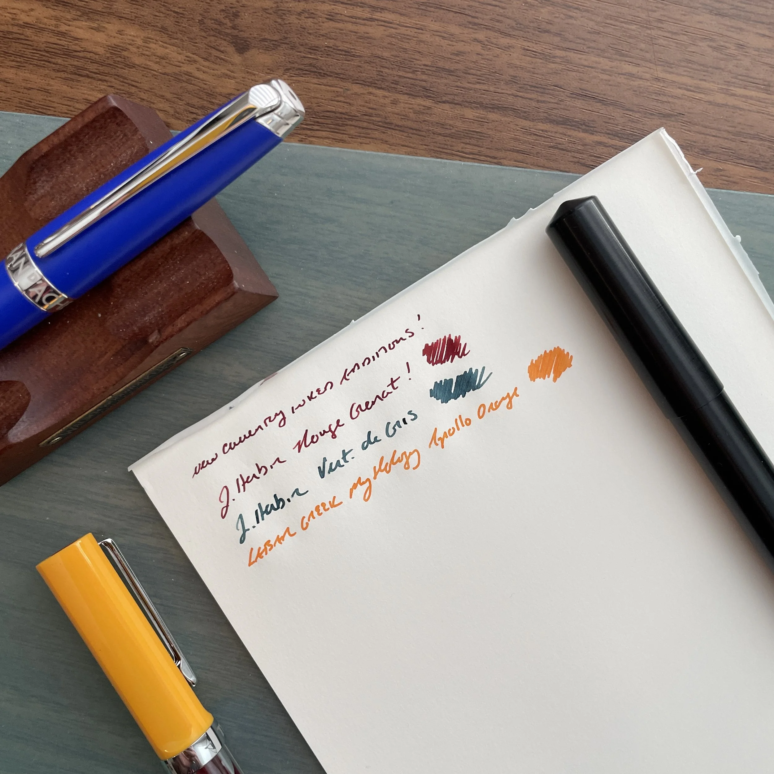 None of these inks would typically be considered exciting, but for work they strike an appropriate balance. “Professional” doesn’t have to mean “boring” - you just have to know where to draw the line. My own rule of thumb is that the ink you use in the office shouldn’t overshadow or distract from the substance of the work you are trying to do. (i.e., You want the person whose memo you are commenting on to focus on the substance of your edits, not the fact that you wrote said edits in fluorescent orange shimmer ink.) On most standard office paper, and to the fountain-pen-uninitiated, these inks will appear blue. When you’re back at your own desk, however, writing on your quality paper of choice, you’ll enjoy the bit of dark red sheen on the Iroshizuku Inks, the shading on the Laban Poseidon Blue, and if you’re really daring, the faintest hint of pink/red shimmer on the Wayfarer!